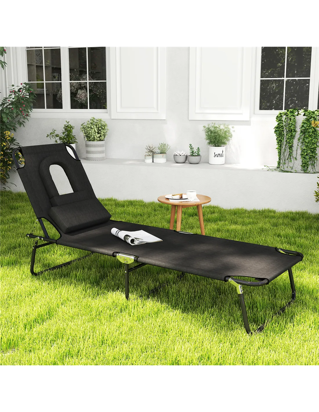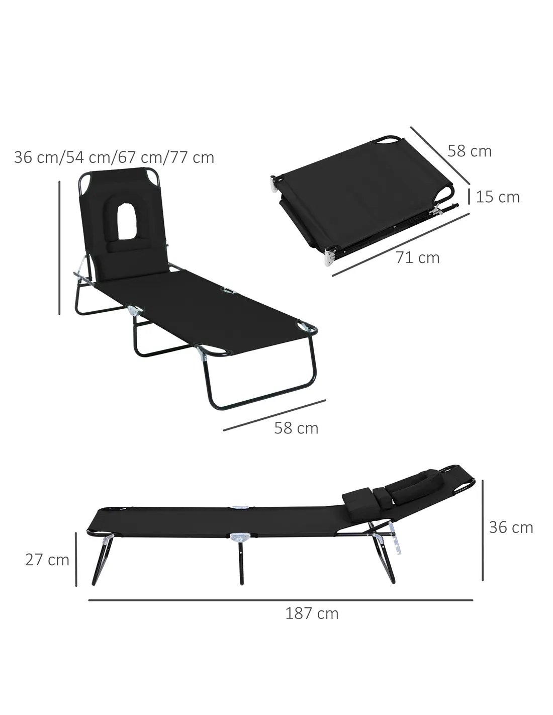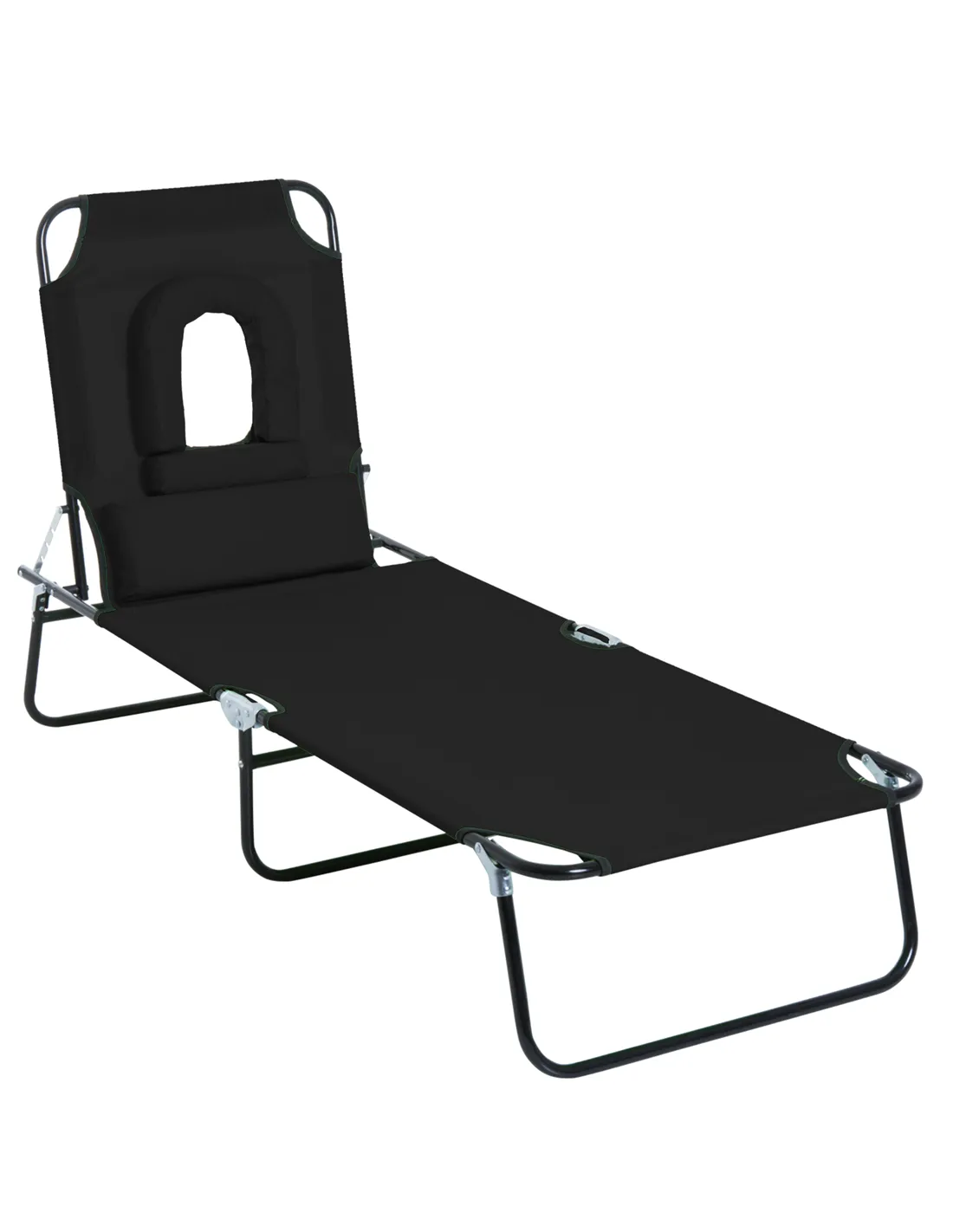 Outsunny Outdoor Folding Sun Lounger with Face Hole, 4 Level Adjustable Backrest Reclining Garden Lounger, Garden Recliner Sunbed with 600 D Oxford Cloth Seat and Pillow for Beach, Black