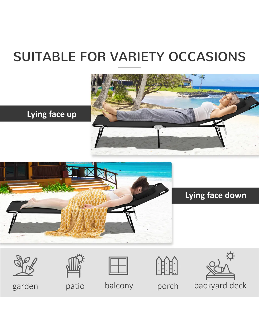 The Outsunny folding sun lounger is ideal for a variety of outdoor settings, from relaxing in your garden to enjoying a day at the beach. Its adjustable backrest with four reclining positions allows you to find the perfect angle for sunbathing, reading, or simply unwinding. The padded face hole offers exceptional comfort when lying on your front, making it suitable for sunbathers and those seeking a massage-style rest. Thanks to its foldable steel frame and lightweight design, it’s easy to transport and store, perfect for camping trips, poolside lounging, or even balcony relaxation. The durable 600D Oxford cloth seat and pillow provide breathable support, ensuring comfort during long hours outdoors.