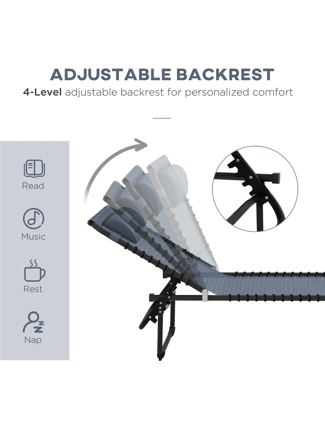 - 4-Level Backrest Height: 76cm, 60cm, 45cm, 31cm