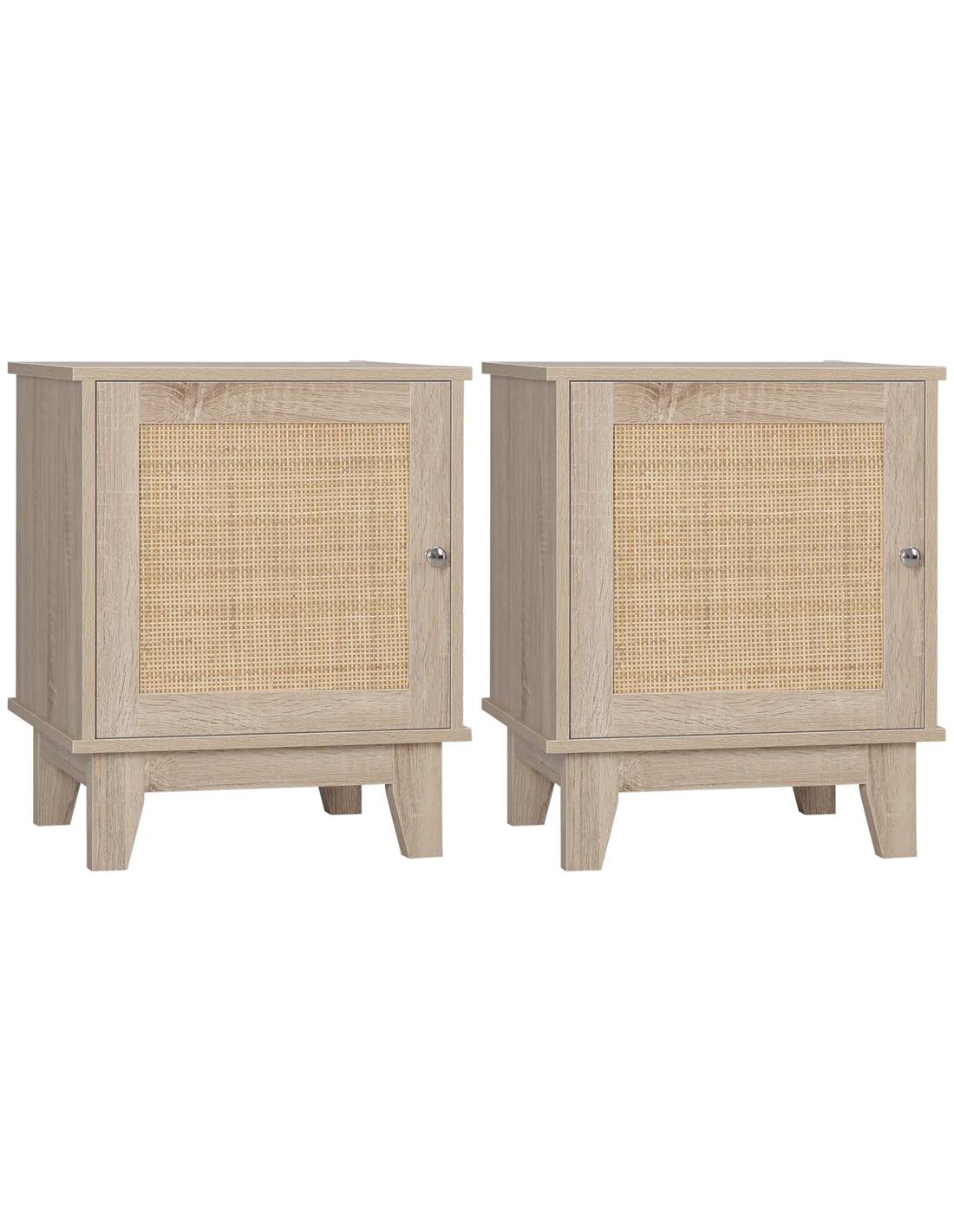 HOMCOM Bedside Table, Bedside Cabinet with Storage Cupboard, Side End Table with Rattan Element for Living Room, Bedroom, Set of 2, Natural