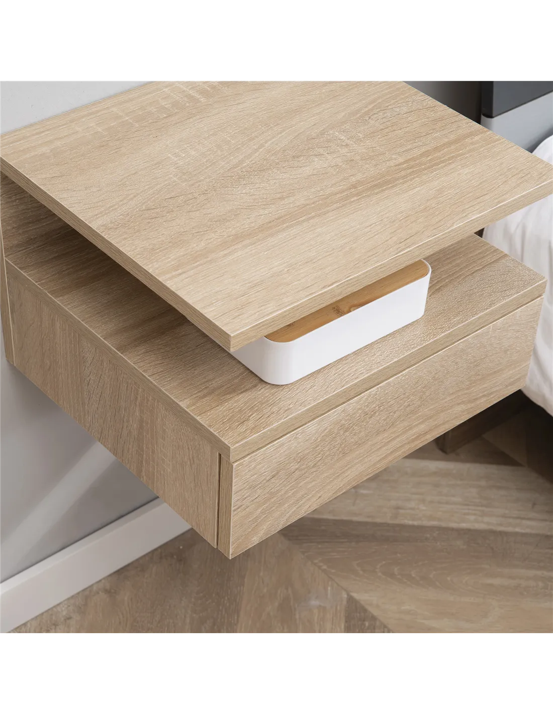 The HOMCOM floating bedside tables in oak tone offer a stylish and practical solution for modern bedrooms. Ideal for those seeking to maximise floor space, these wall-mounted units provide convenient storage for essentials such as books, lamps, alarm clocks, and personal items. Their minimalistic design complements a variety of interior styles, from contemporary to Scandinavian. Use the pull-out drawer to keep smaller items organised and the open shelf to display decorative pieces or keep your favourite bedtime reads within easy reach. Perfect for compact rooms or shared bedrooms, these bedside tables help maintain a tidy and clutter-free environment.