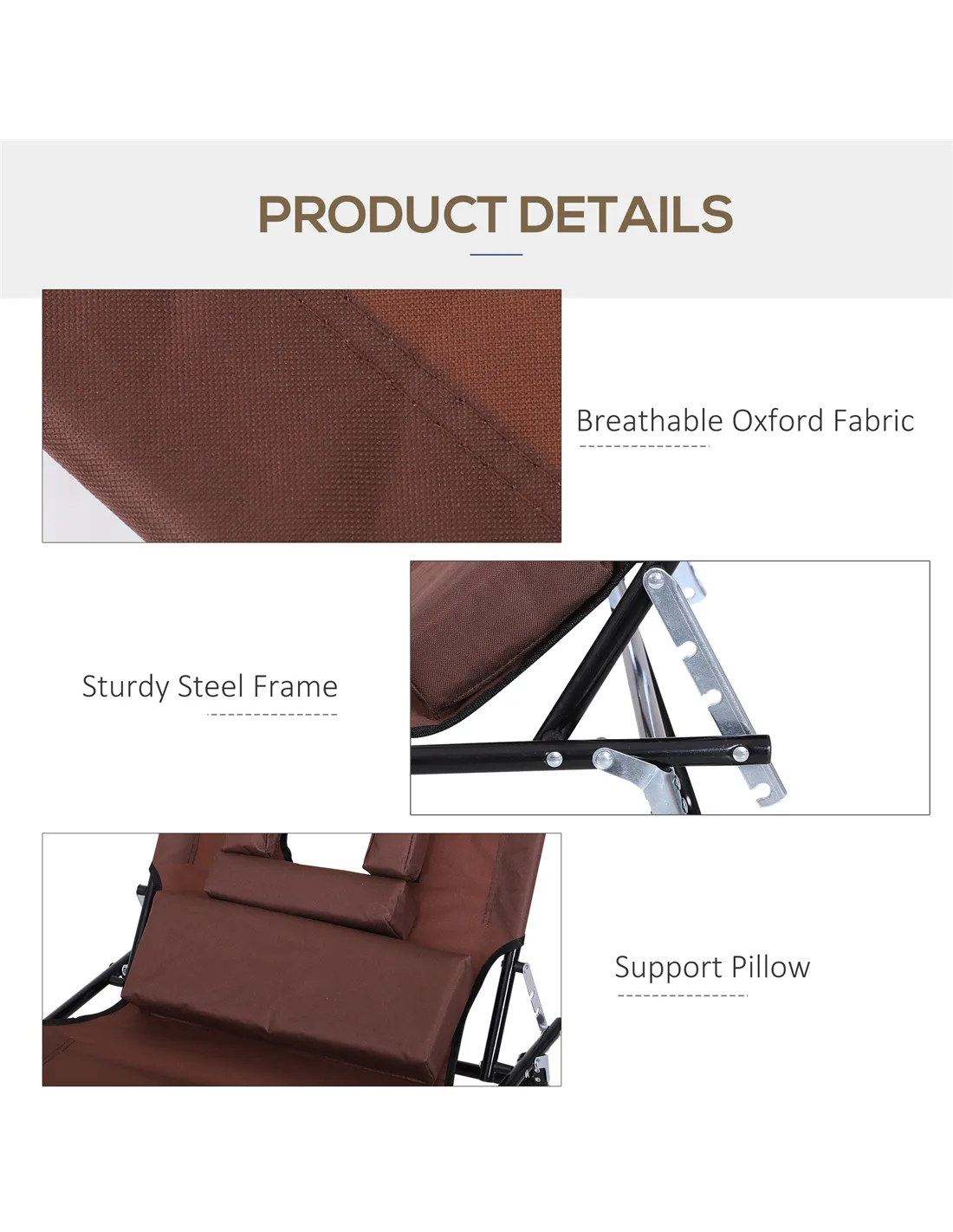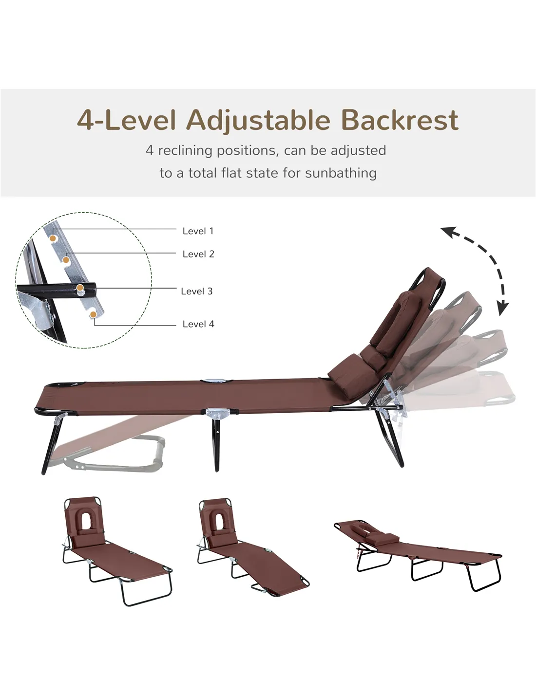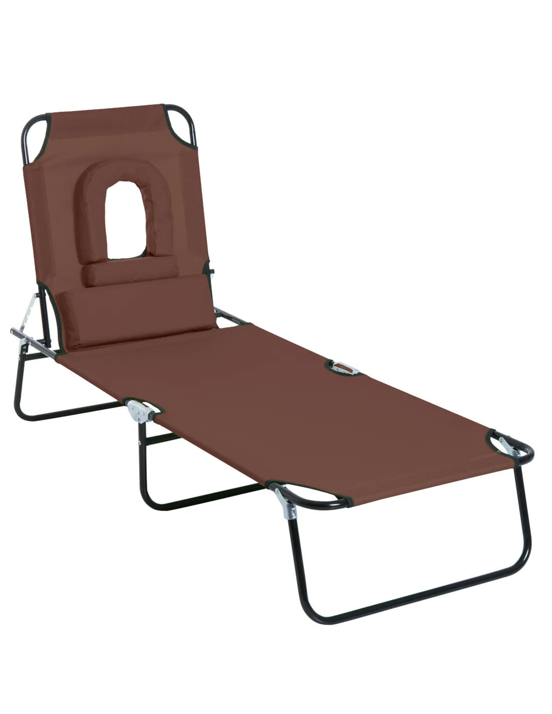Outsunny Outdoor Folding Sun Lounger with Face Hole, 4 Level Adjustable Backrest Reclining Garden Lounger, Garden Recliner Sunbed with 600 D Oxford Cloth Seat and Pillow for Beach, Brown