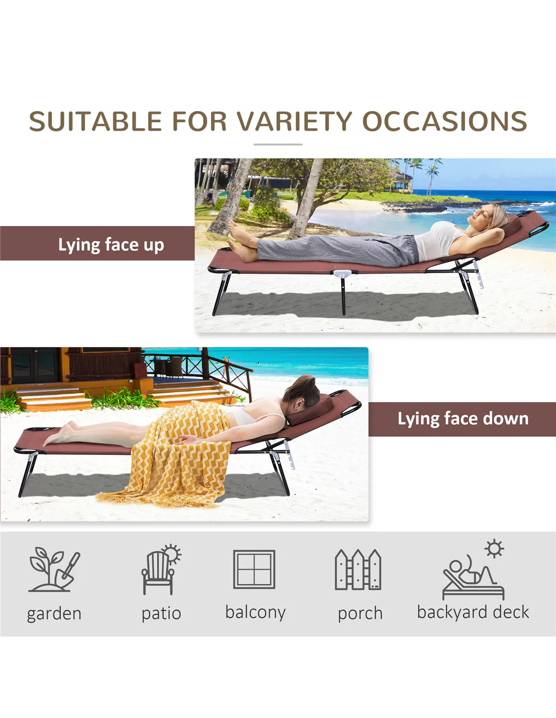 The Outsunny folding sun lounger is ideal for a variety of outdoor settings, offering versatile comfort wherever you choose to unwind. Perfect for relaxing in your garden or on the patio, it also suits beach days thanks to its lightweight, foldable design. The adjustable backrest with four reclining positions allows you to find the perfect angle for sunbathing, reading, or napping. The padded face hole enhances comfort when lying face down, making it a great choice for those seeking a massage-style relaxation experience. Its durable 600D Oxford cloth seat and sturdy steel frame ensure long-lasting use, whether you’re enjoying a summer afternoon or a weekend getaway.