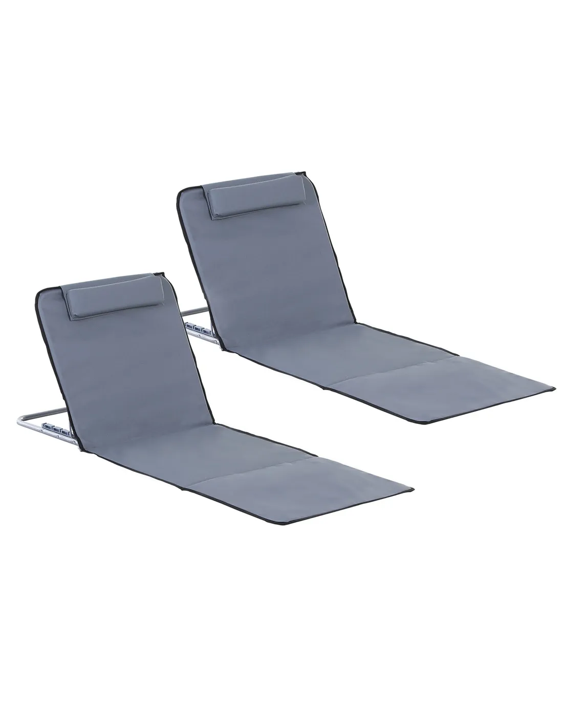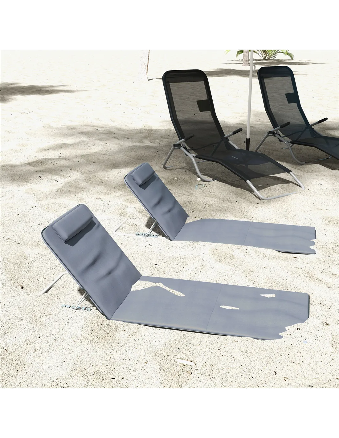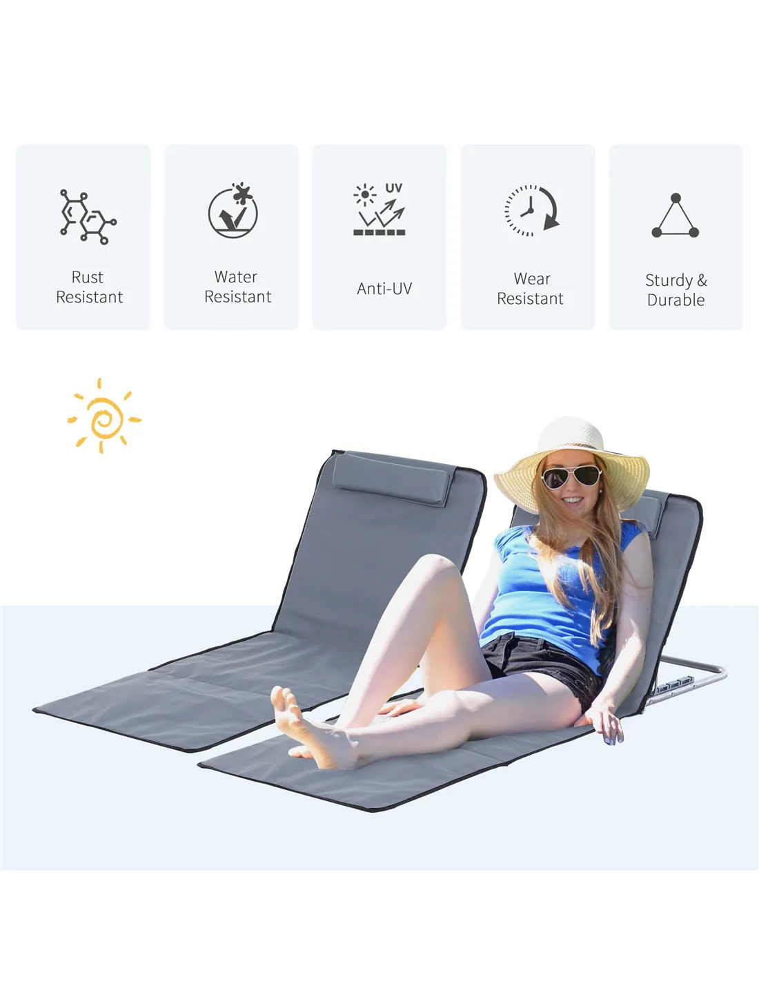 Outsunny Set of 2 Foldable Garden Beach Chair Mat Lightweight Outdoor Sun Lounger Seats Adjustable Back Metal Frame PE Fabric Head Pillow w/ Carry Bag,Grey