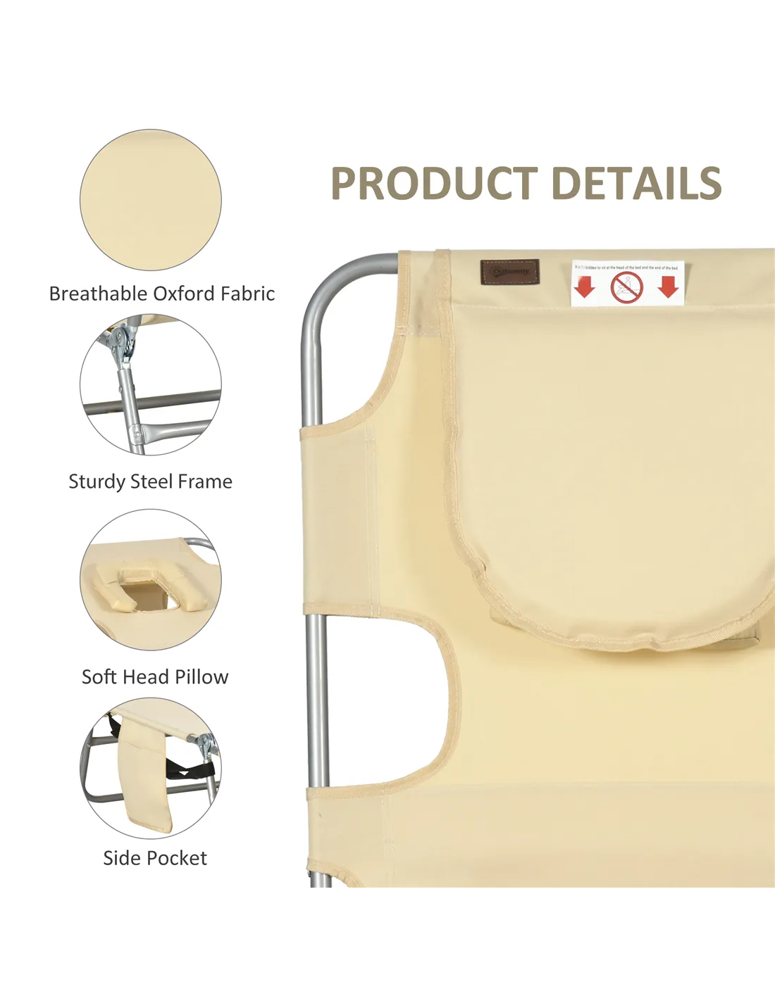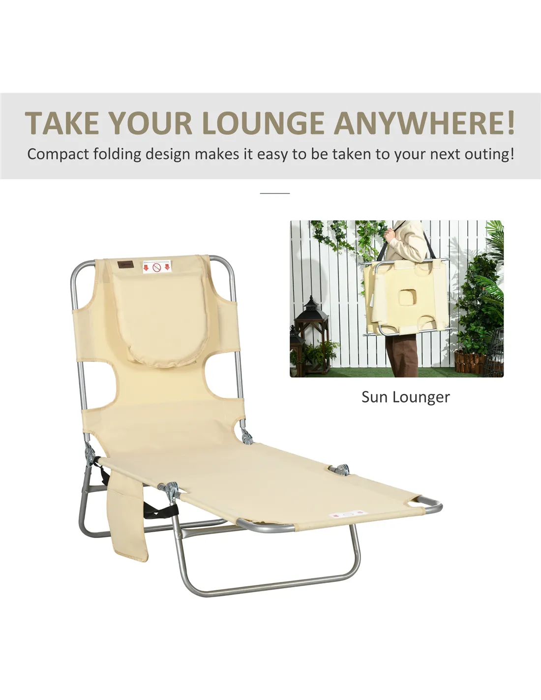 Outsunny Foldable Sun Lounger, Beach Chaise Lounge with Reading Hole, Arm Slots, 5-Position Adjustable Backrest, Side Pocket, Pillow for Garden, Beach, Pool, Beige