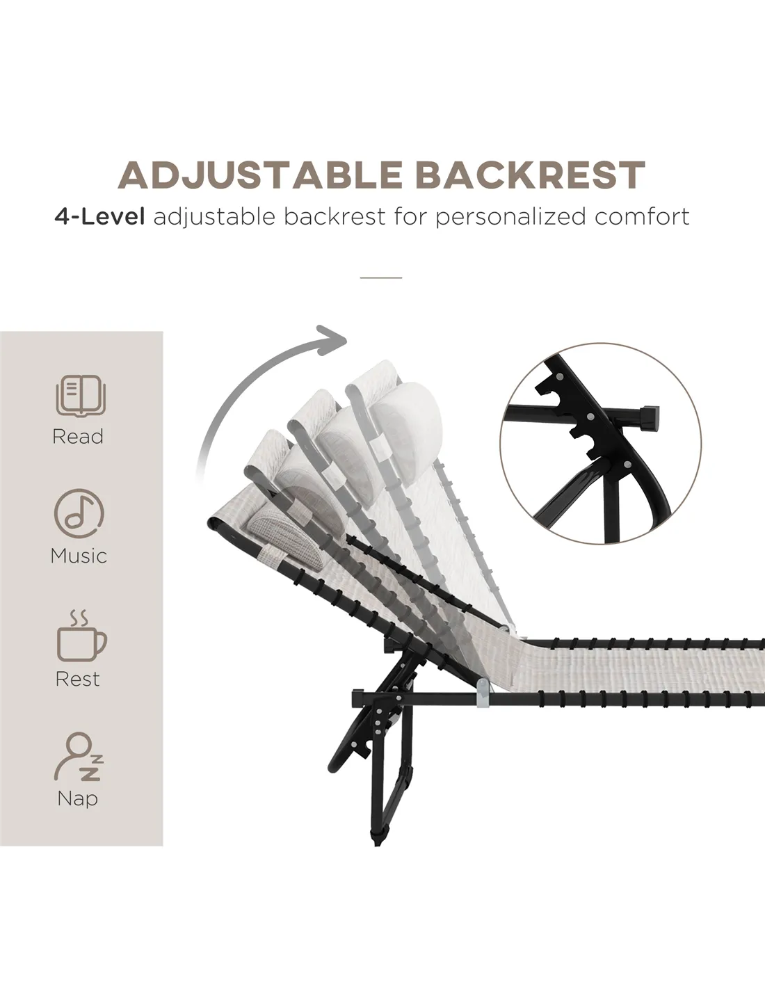 - 4-Level Backrest Height: 76cm, 60cm, 45cm, 31cm