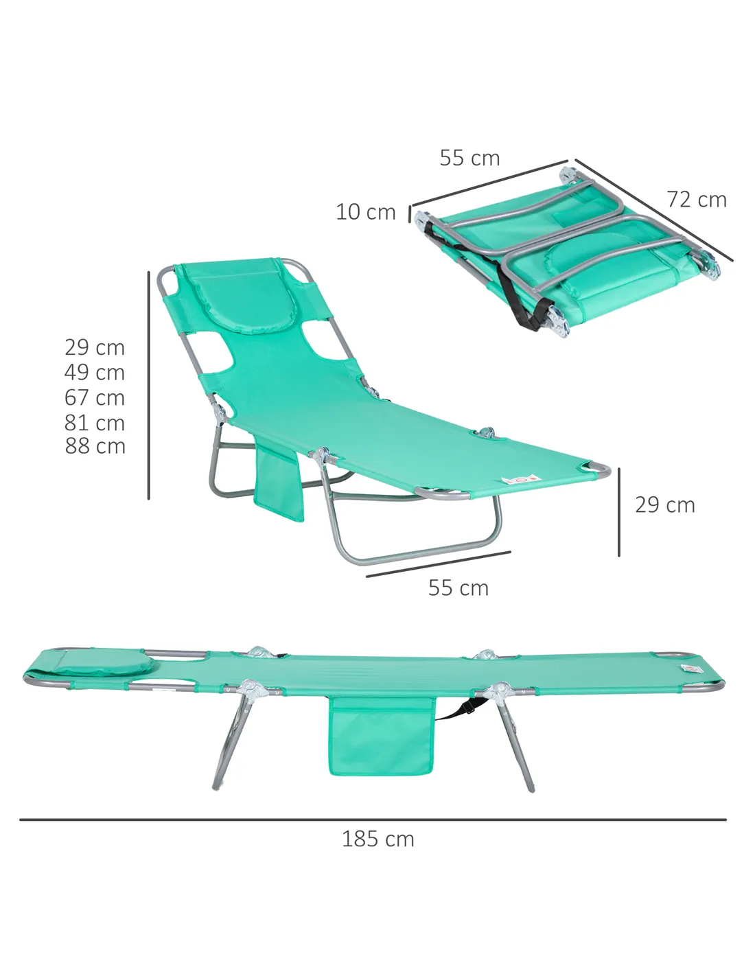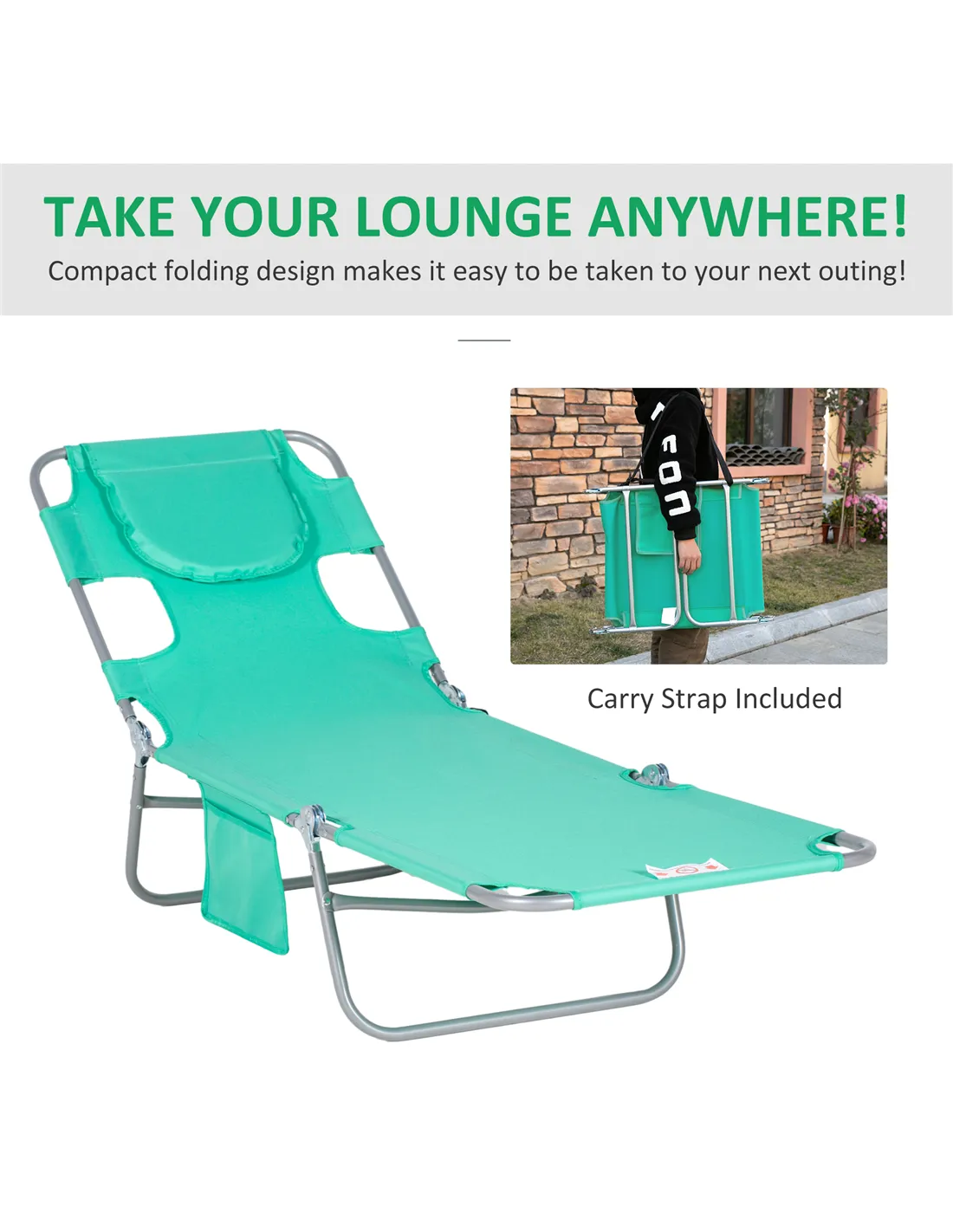 A cool update on the foldable sun lounger from Outsunny. Features a padded head hole at the front to allows you to rest your face in comfortably, which is perfect for relaxing or even reading a book! The powder coated steel frame is strong and solid to support up to 120 kg. The reclining backrest is five positions adjustable, easy to set and lock to a position you like best. Complete with a handy side pocket.