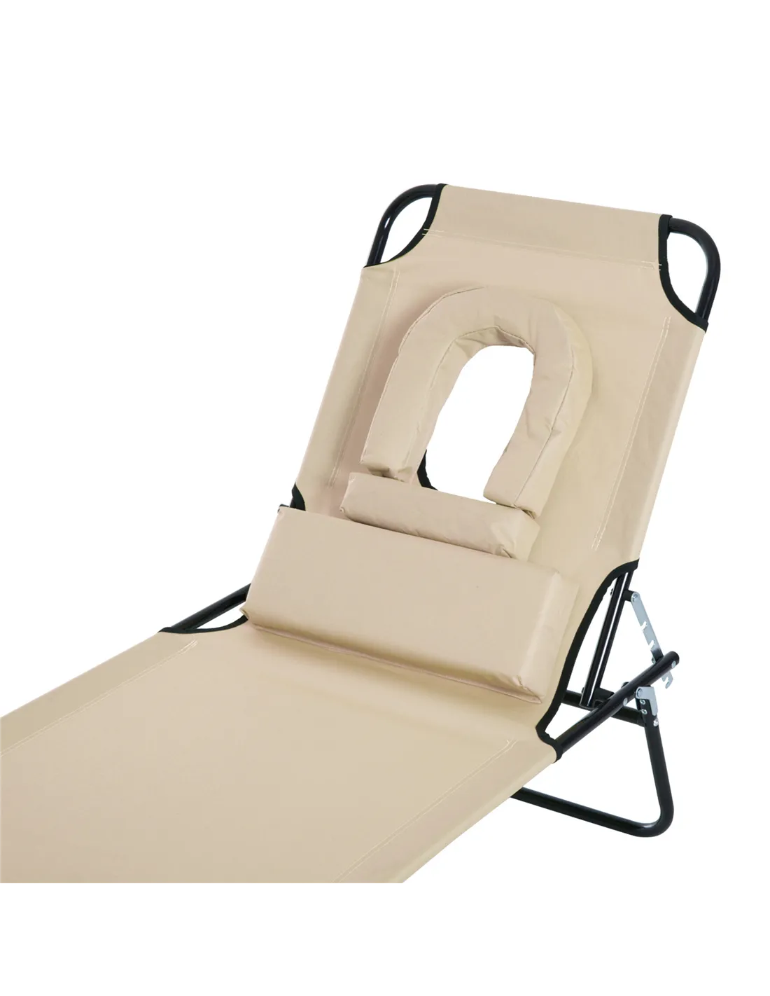 Outsunny Outdoor Folding Sun Lounger with Face Hole, 4 Level Adjustable Backrest Reclining Garden Lounger, Garden Recliner Sunbed with 600 D Oxford Cloth Seat and Pillow for Beach, Beige