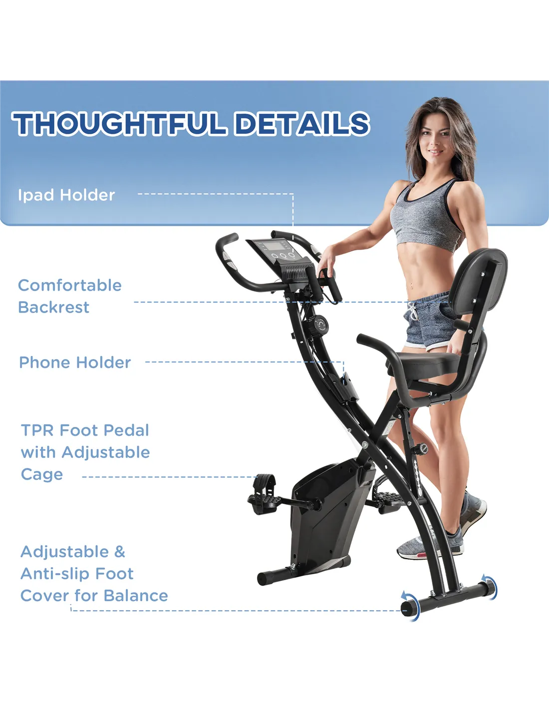Enjoy a complete cardio workout with the HOMCOM indoor exercise bike. Great for home use, it features an LCD monitor that tracks time, speed, distance, heart rate and calories burned to help you achieve your fitness goals. Use it as an upright or recumbent bike, plus take advantage of the tension ropes to strengthen your biceps. The phone holder keeps your device nearby so you can watch videos, play music and more while you exercise. When you're done, simply fold the bike for easy storage.