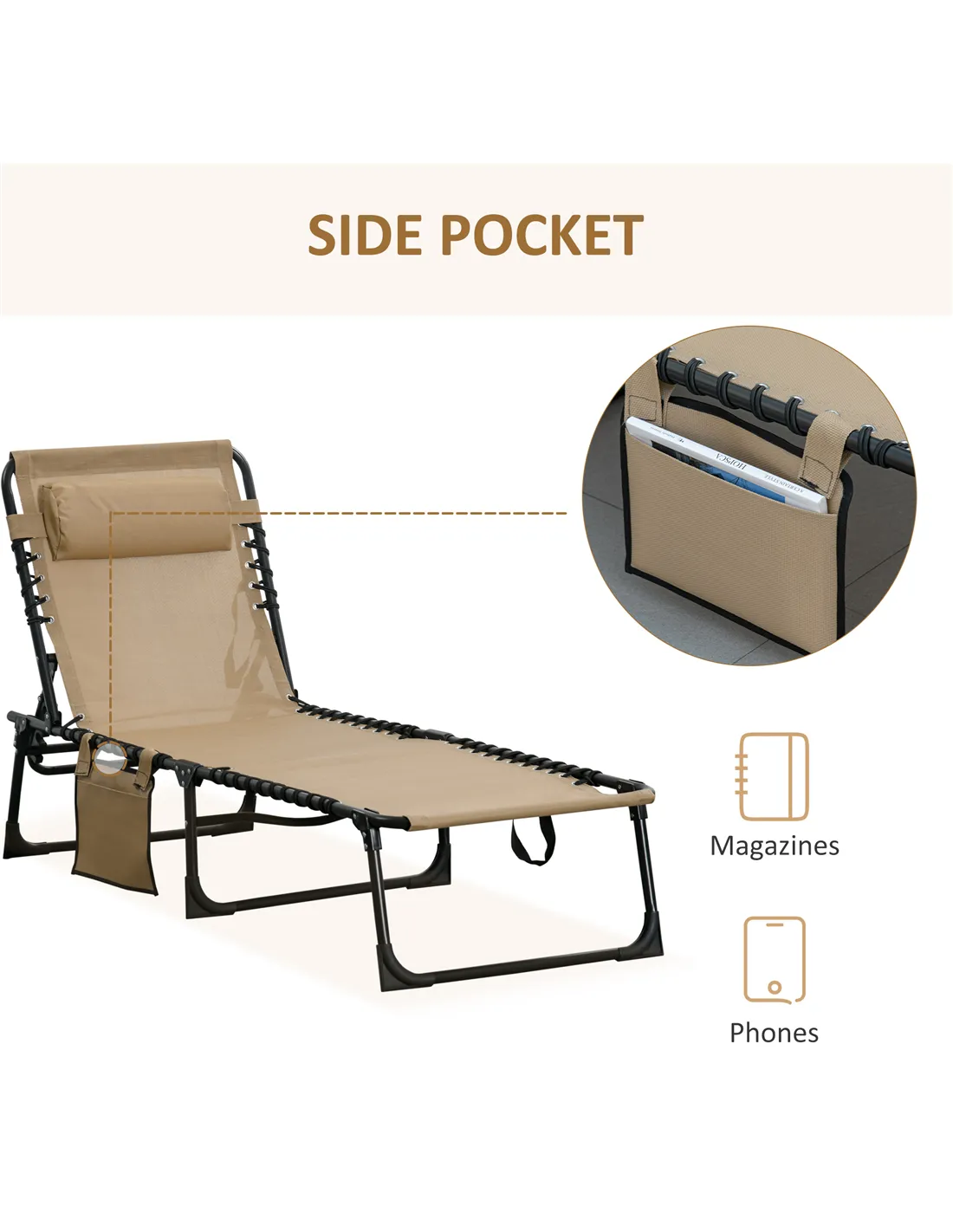 Outsunny Portable Sun Lounger, Folding Camping Bed Cot, Reclining Lounge Chair 5-position Adjustable Backrest with Side Pocket, Pillow for Patio Garden Beach Pool, Beige