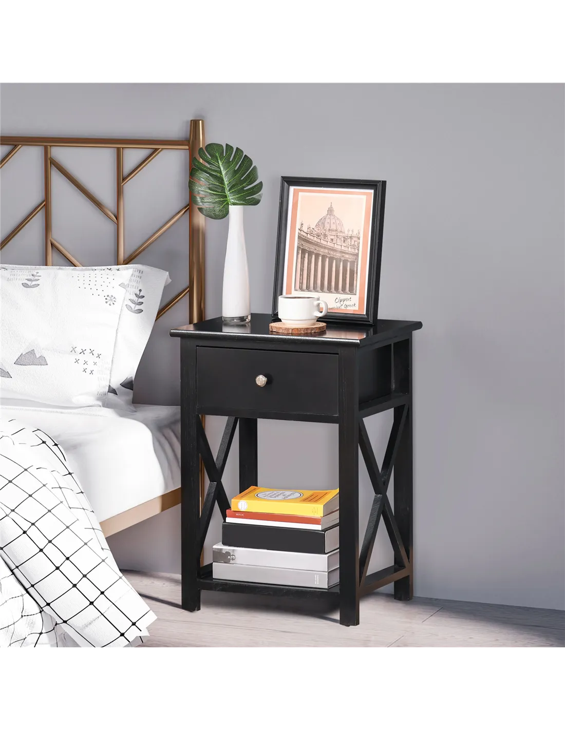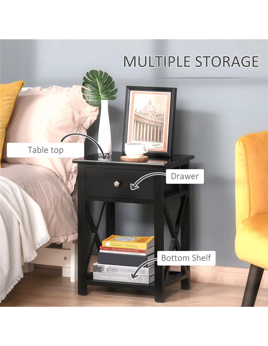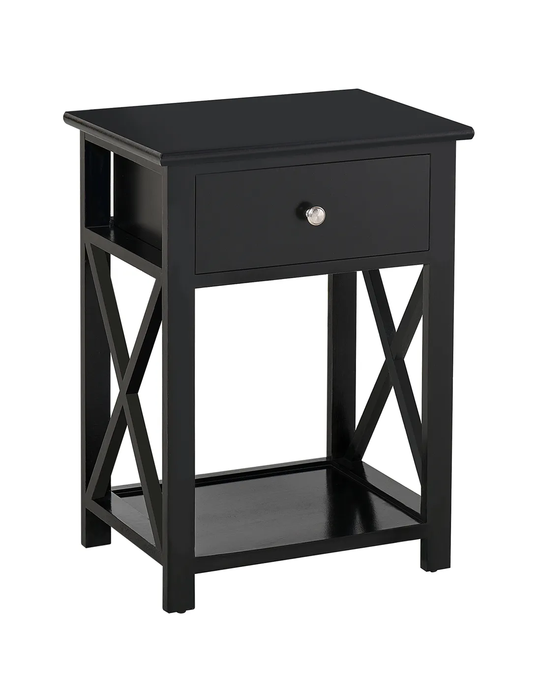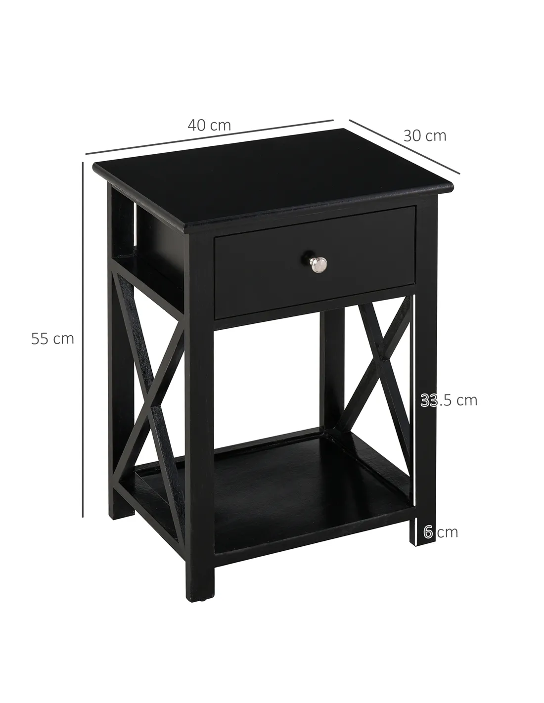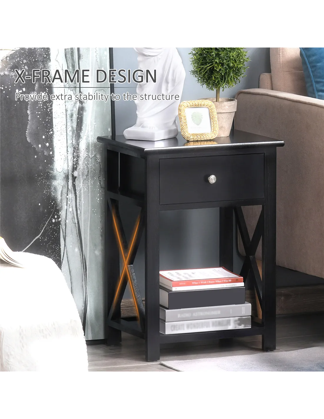 HOMCOM End Table, Sofa Side Table with Drawer X Bar Bottom Storage Shelf, Nightstand Bedside Table for Bedroom or Living Room Black