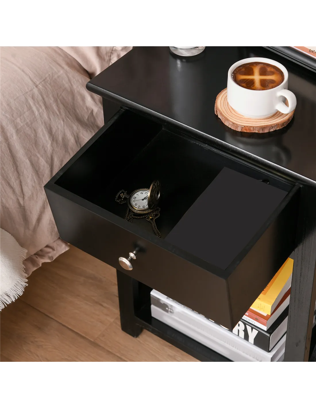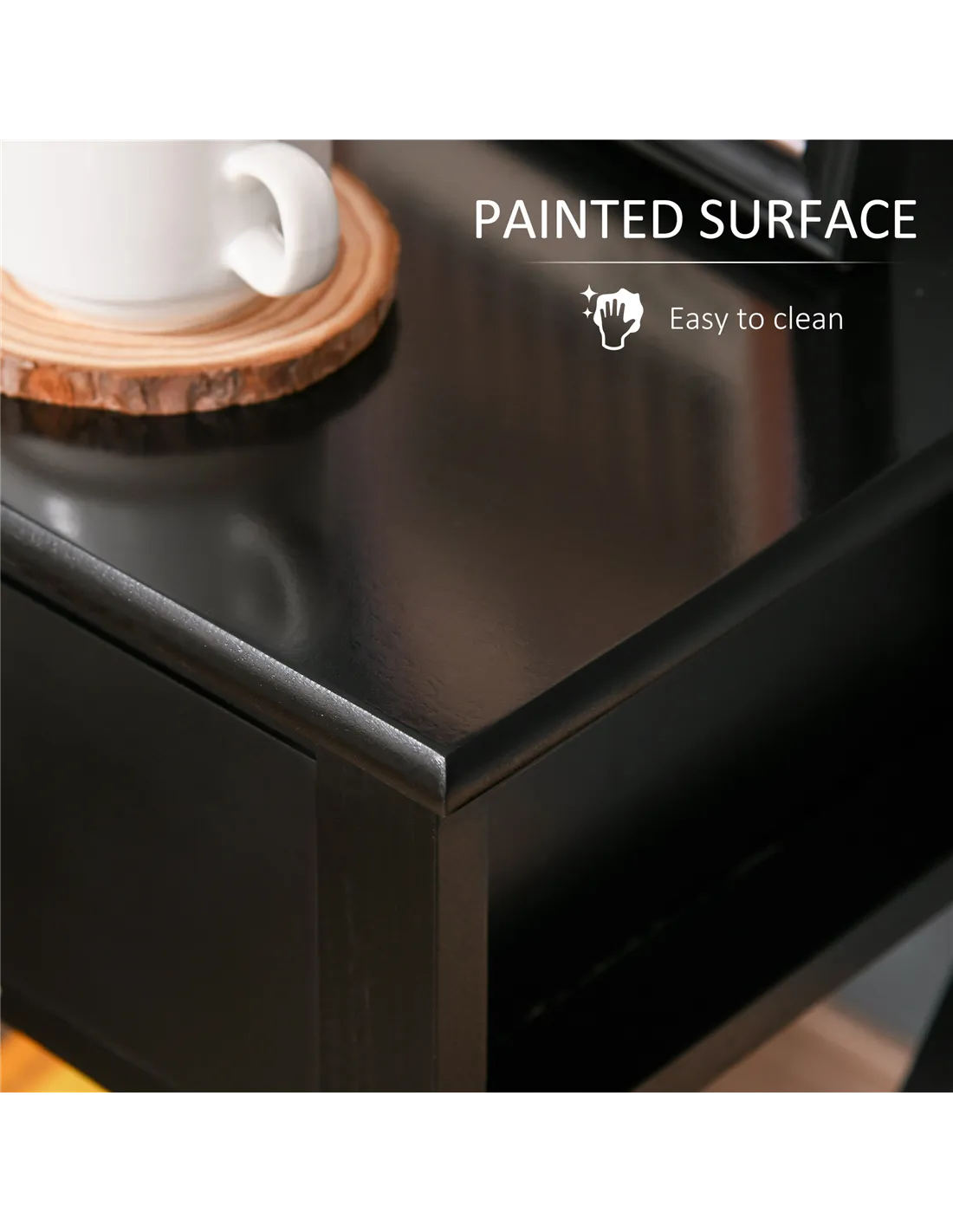 - Features a top drawer and bottom shelf for plenty of storage