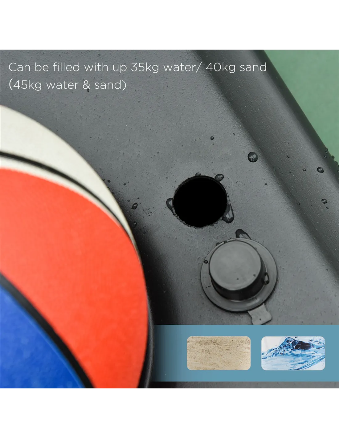 The base can be filled with up to 35kg of water or 40kg of sand, or a mixture of both up to 45kg, ensuring excellent stability even during vigorous games. - Is the basketball hoop easy to move around?
