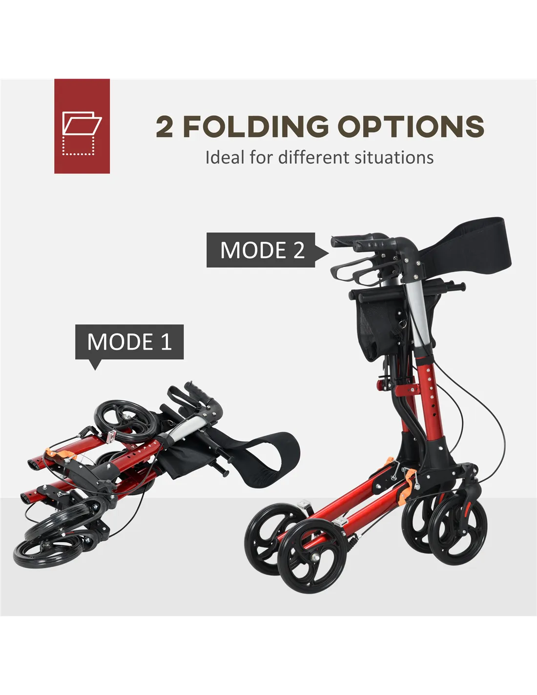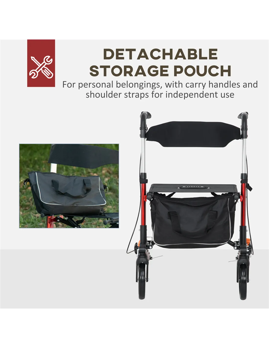 HOMCOM Folding Rollator Walker with Seat and Backrest, Lightweight Walking Frame with Detachable Storage Bag, Dual Brakes, Adjustable Handle Height, 4 Wheeled Walker for Seniors, Handicapped, Red