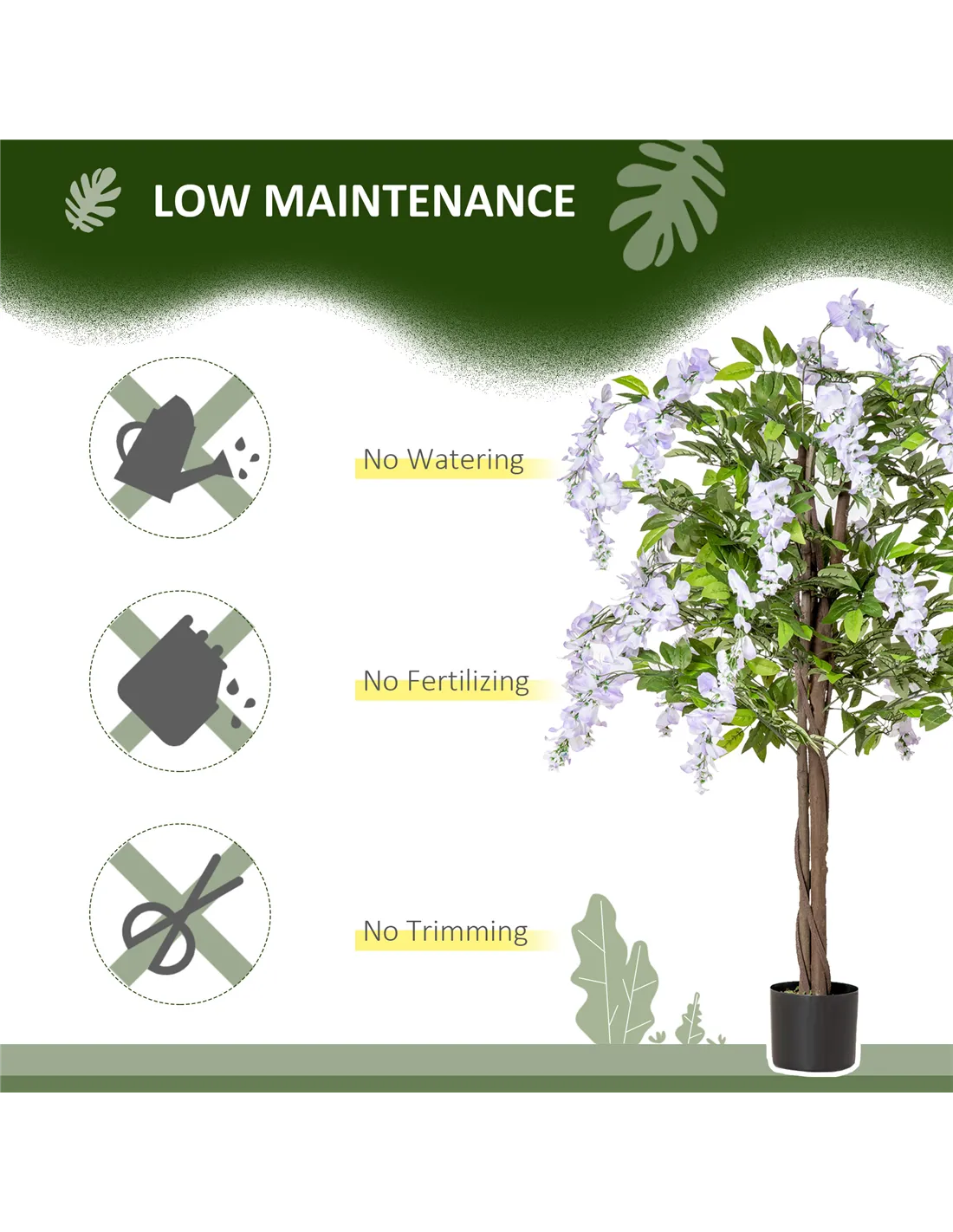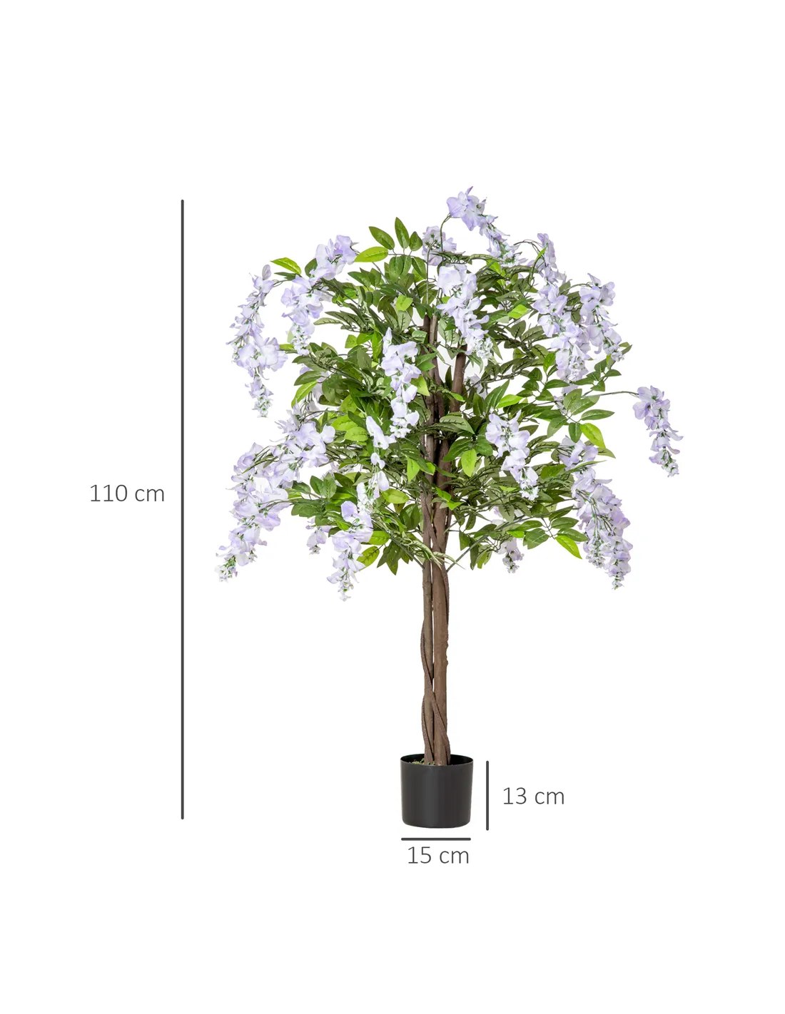 This artificial Wisteria fake tree is a beautifully natural design, it's difficult to distinguish from a real plant. The artificial blossom tree will bring a touch of nature into your home and outdoor areas all year round, without the constant upkeep of watering, trimming and fertilising. 840 leaves and 36 flowers for a full look, complete with a cement-filled plant pot.