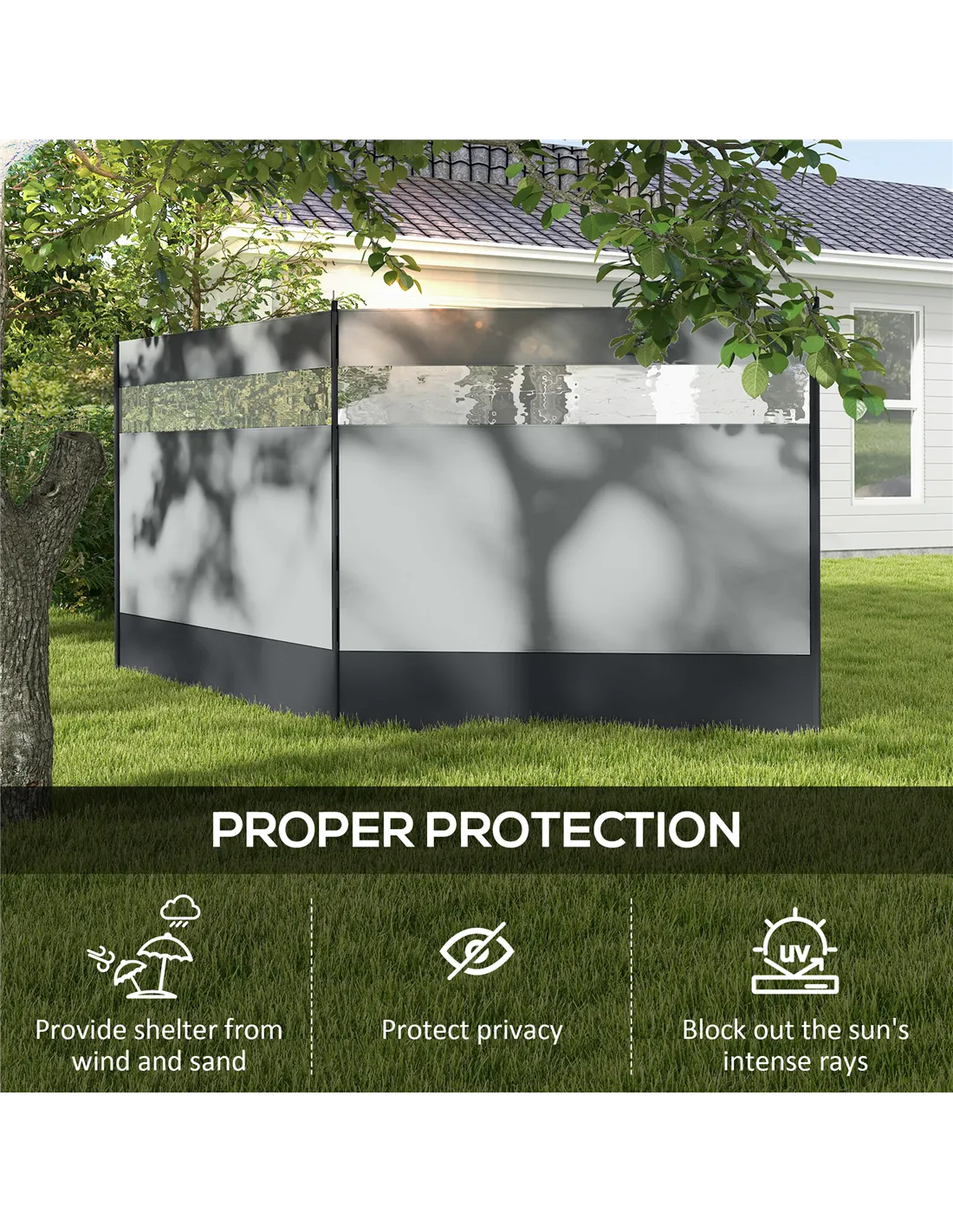 Protection at the beach, so you can enjoy the sunshine more: this Outsunny windbreaker. 440cm long provides plenty of shade, with a top transparent panel to bring in a gentle touch of light from the other side. Steel poles hold the fabric together and taught, firmly inserts into the ground. Kit comes with 12x ground stakes and 7x guy ropes to pin to ground for extra stability. Bag also included to carry around easily.
