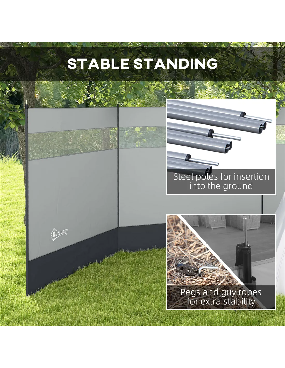 - Steel poles hold fabric panels in place and slot firmly into the ground