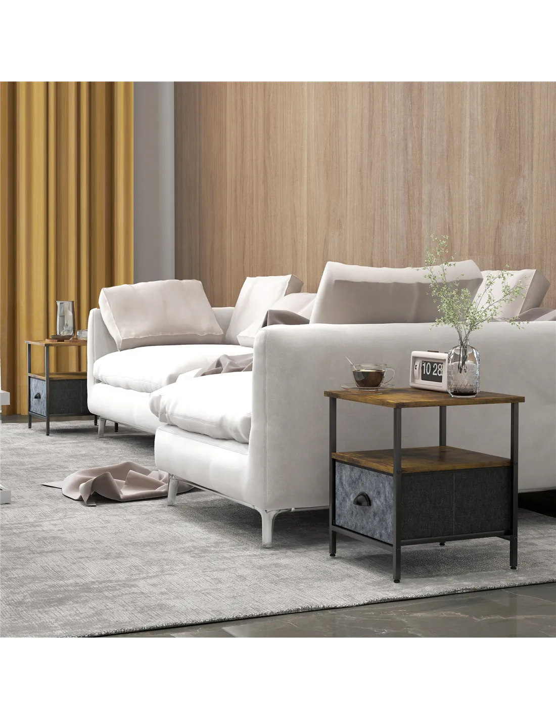 Industrial-style just stepped up: this set of 2 HOMCOM side table. A two-tone dark wood-effect design, paired with the matte black frame and grey drawer creates a striking and stand-out look, for a point of difference in the home. Comes with a bottom fabric drawers, an open shelf and a table top - plenty of handy storage space. The frame, made from metal, is robust, with adjustable feet to finish, so it always keeps balanced. Why not use as a bedside table?