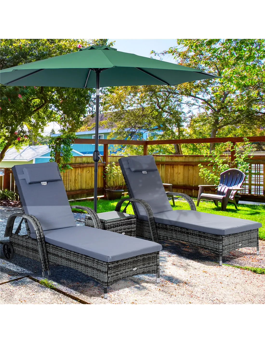 Outsunny 3 Pieces Rattan Sun Loungers, Garden Wicker Wheeling Recliner , PE Rattan Lounge Chairs w/ Cushions & Side Coffee Table Grey