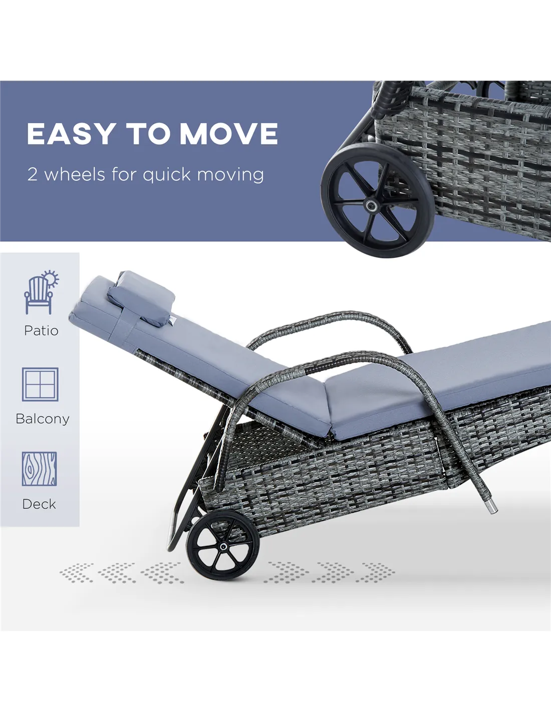 - Use the wheeling recliners to easily reposition your seating to follow the sun or shade throughout the day.