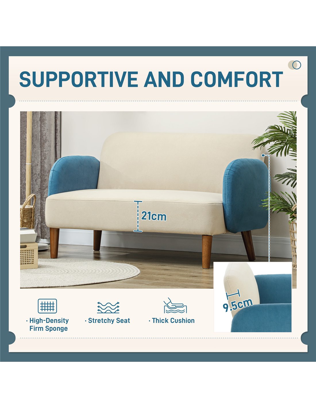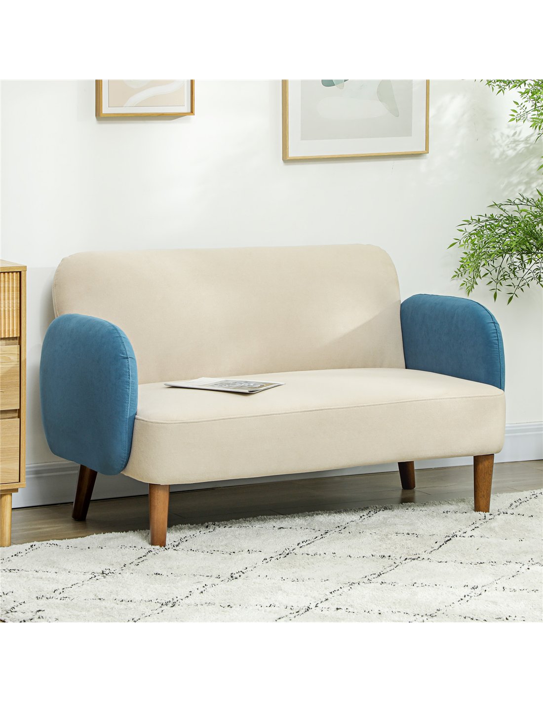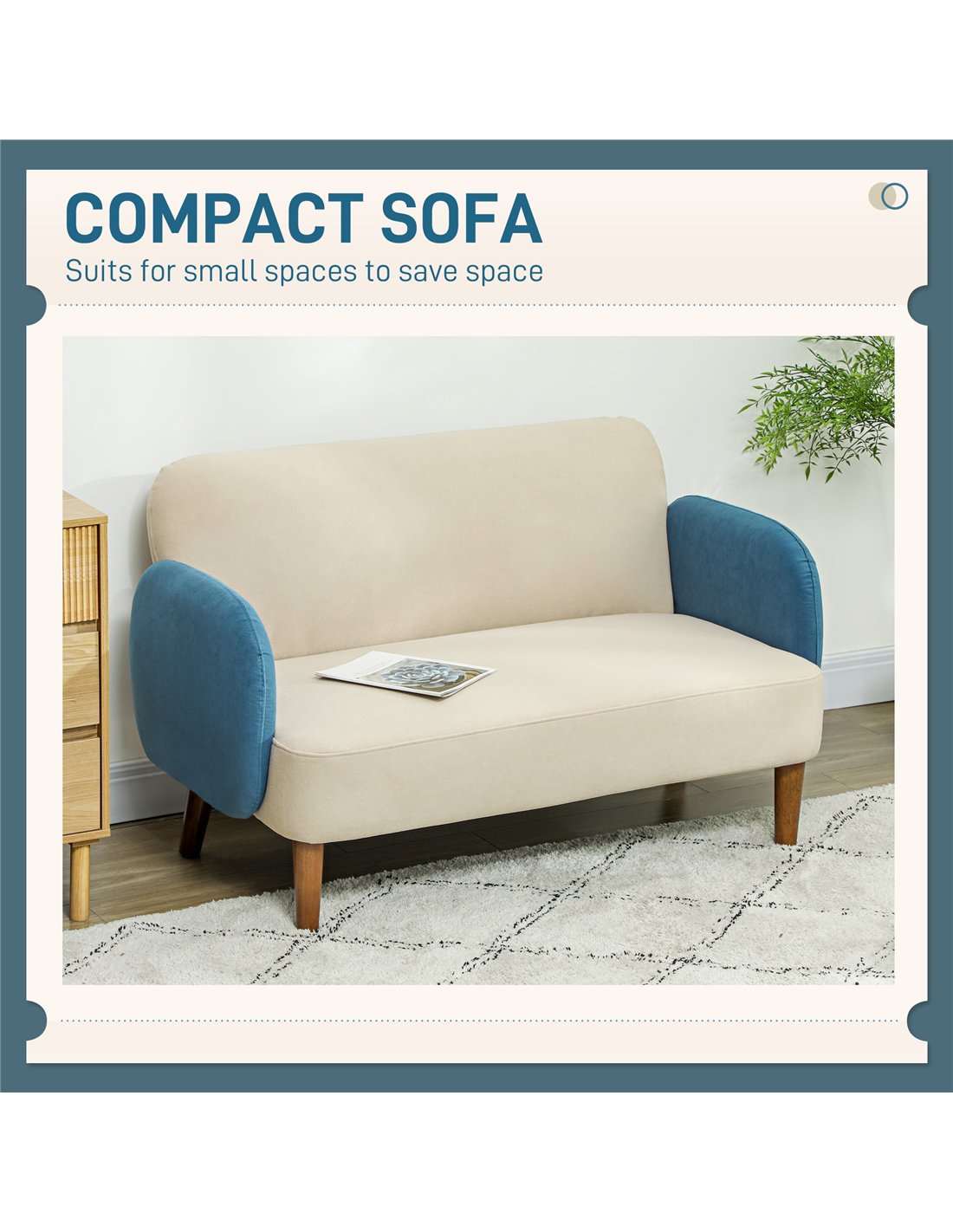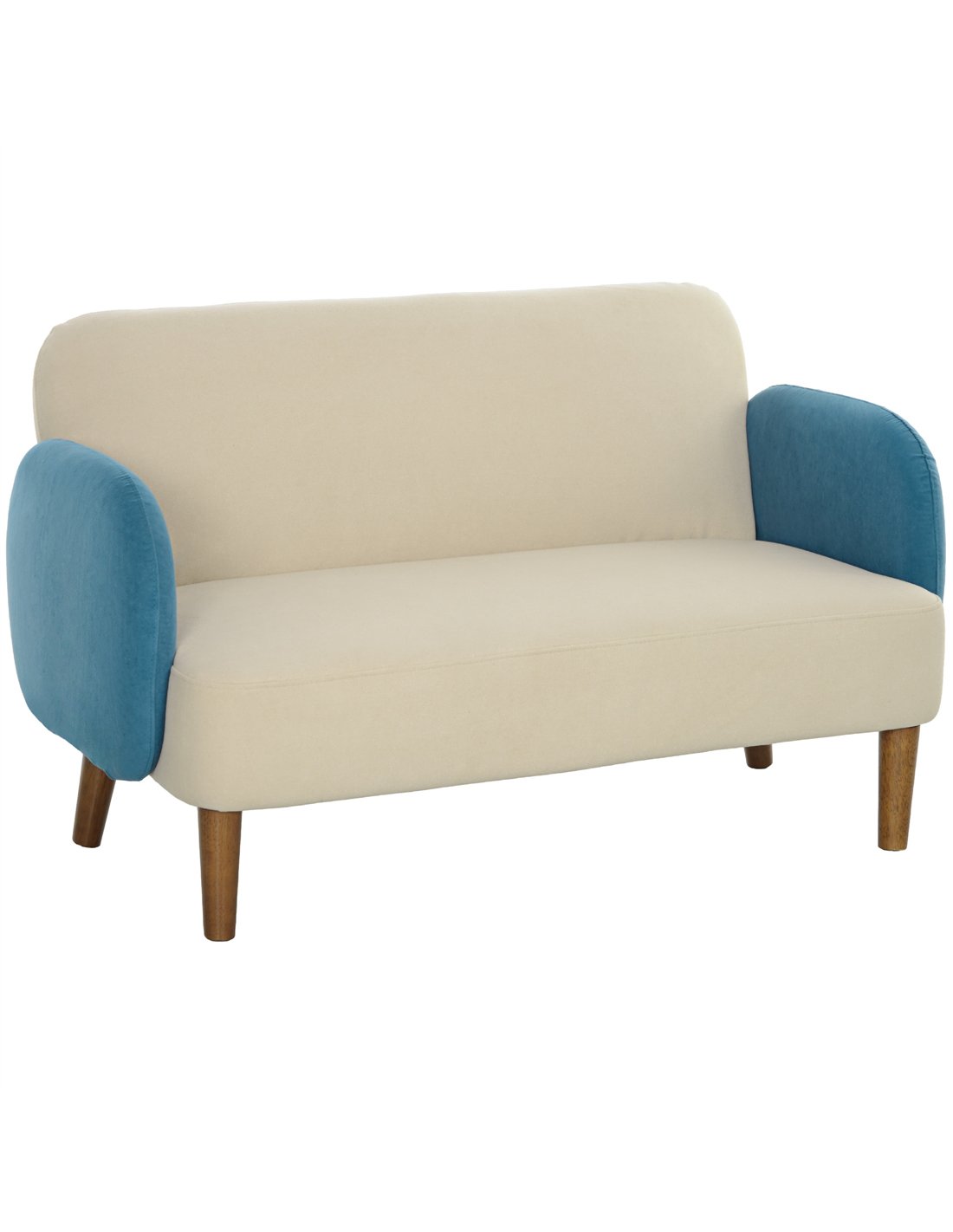 - Perfect for compact living rooms or cosy corners, this two-seater sofa adds a stylish Mid Century flair with its cream and blue colour block design.