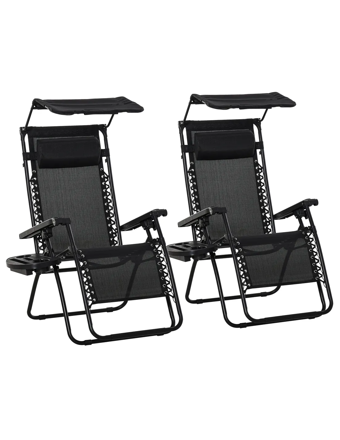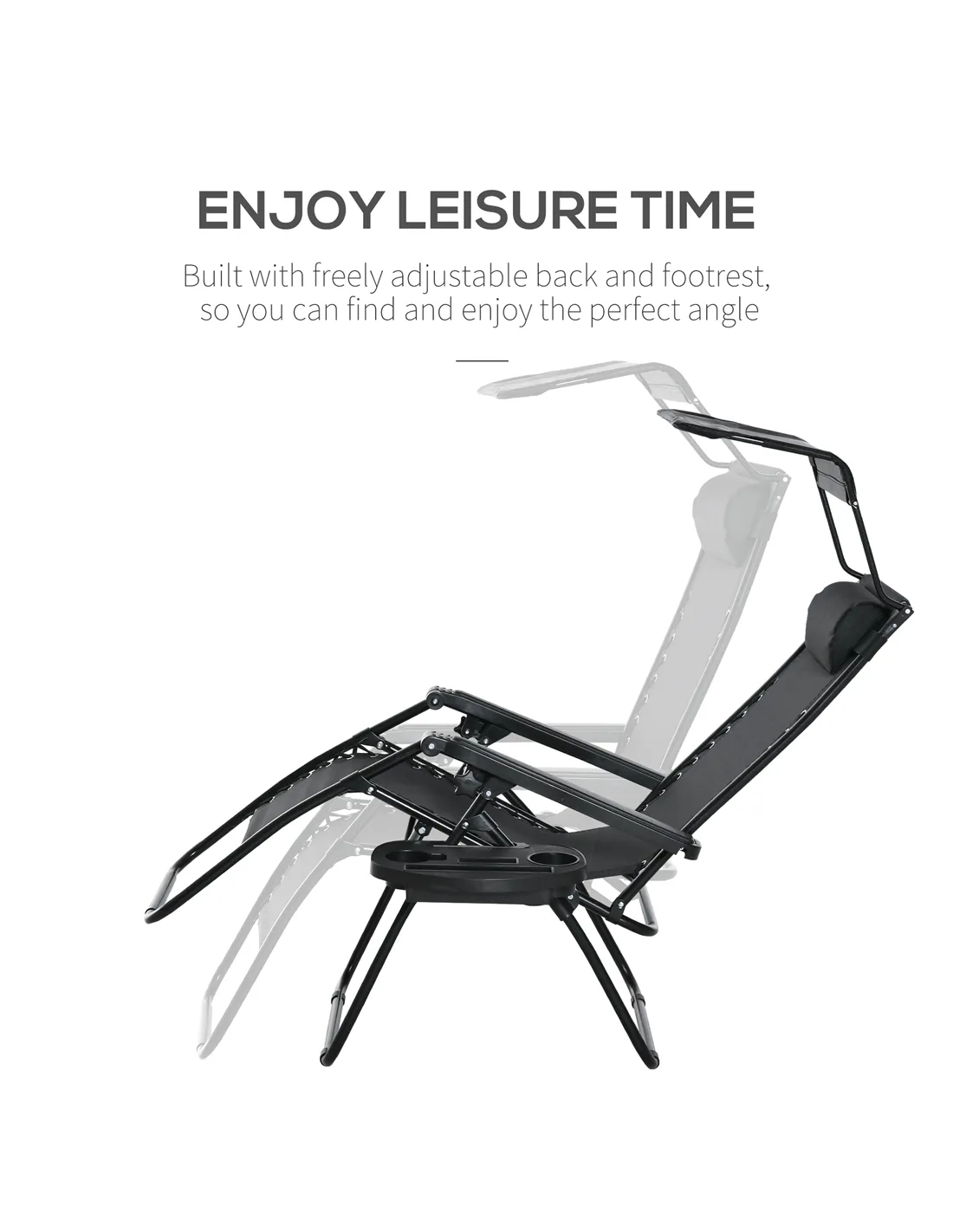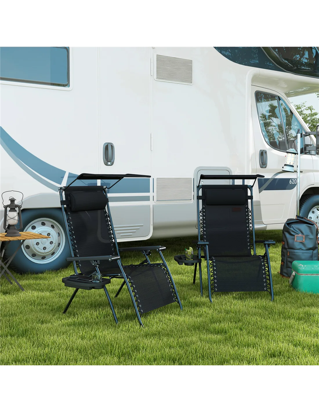 Outsunny 2 Piece Foldable Reclining Garden Chair with Headrest, Zero Gravity Deck Sun Lounger Seat Chair with Footrest, Armrest, Cup Holder & Canopy Shade, Black