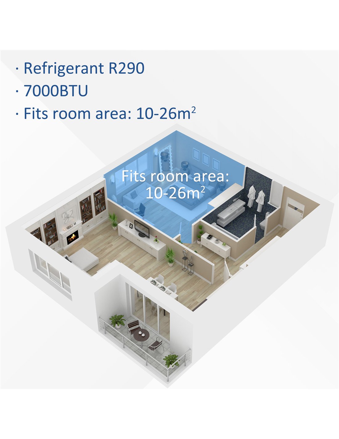 - Powerful R290 refrigerant and 7000 BTU instantly cools your room