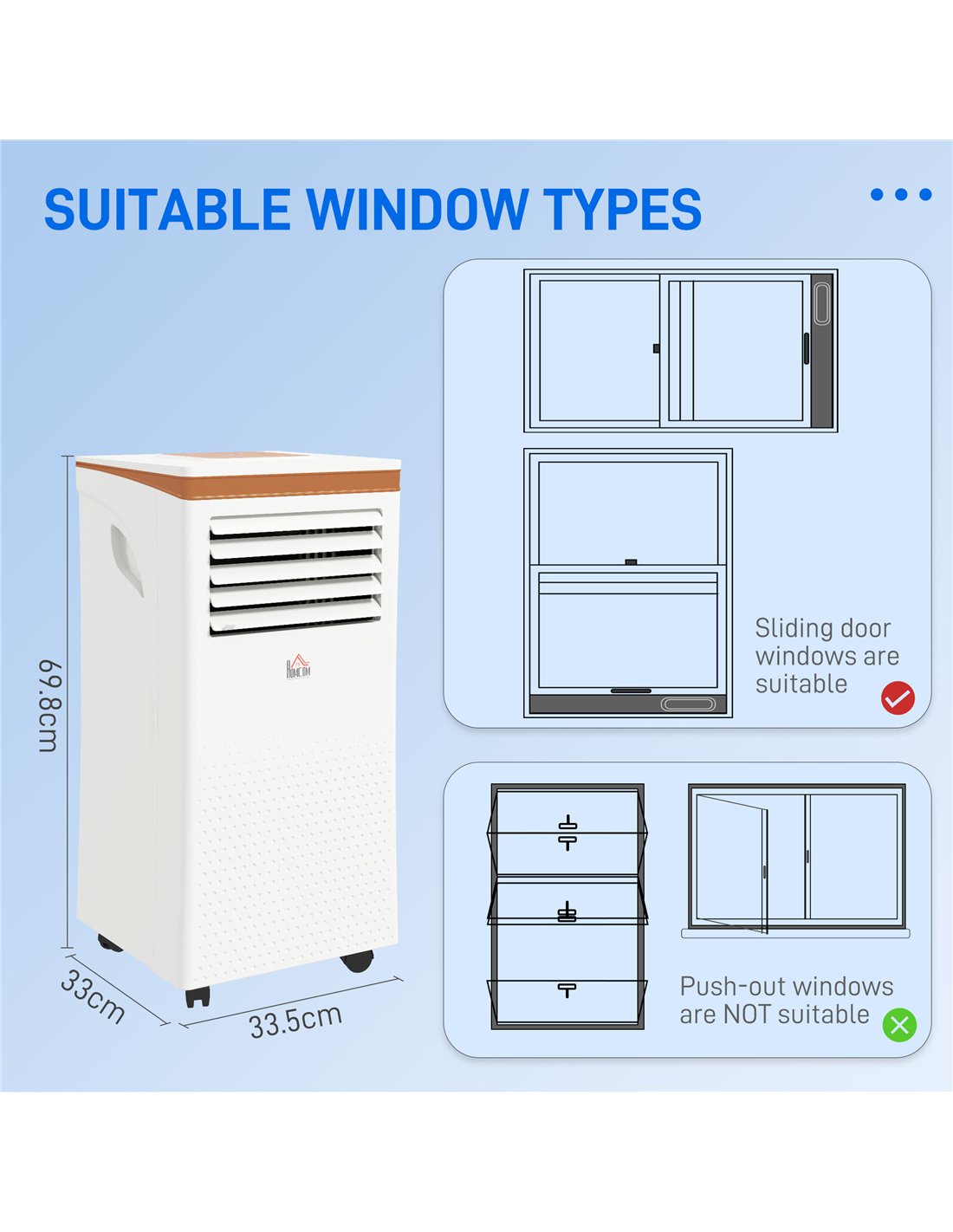The HOMCOM 4-in-1 portable air conditioner is ideal for cooling bedrooms, living rooms, home offices, or small studio flats up to 30㎡. Its compact design with four wheels allows effortless relocation between rooms, making it perfect for seasonal use or temporary cooling needs. Use the dehumidifier function during damp British summers to reduce moisture and improve indoor air quality. The fan mode provides gentle air circulation on milder days, while the sleep mode ensures a comfortable night’s rest by gradually adjusting the temperature. The included window kit simplifies installation, fitting most standard windows for efficient exhaust management.