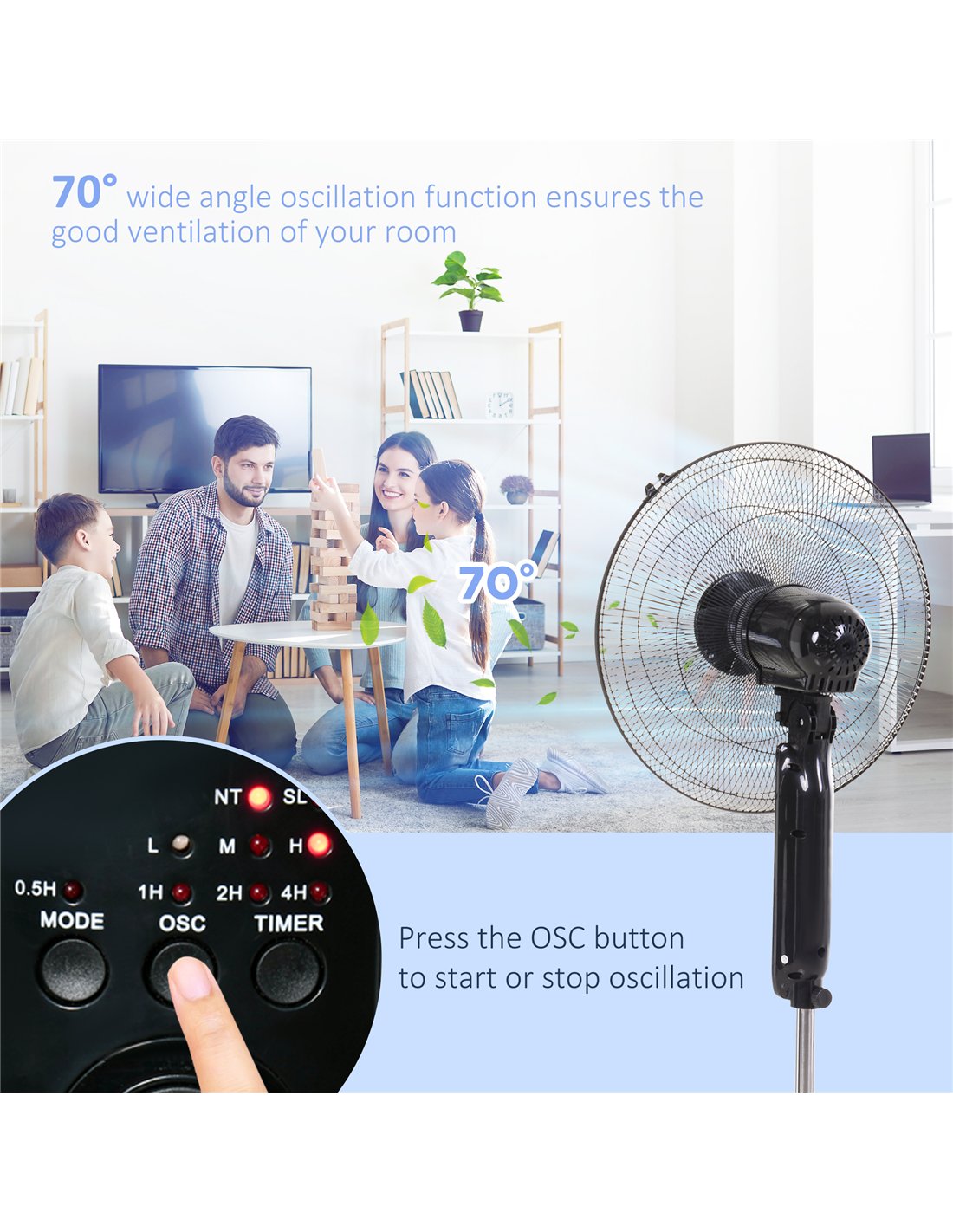 Yes, both oscillation and speed settings can be adjusted via the included remote control or the on-unit buttons for maximum convenience.
