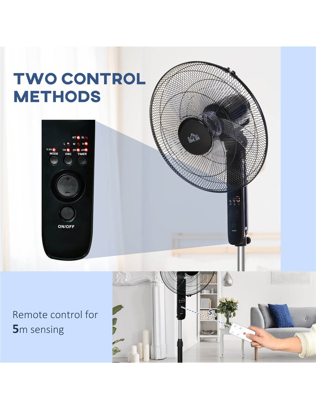 Keep your cool all day long with this metal fan from HOMCOM. It blends together a sturdy round base with a 110-124 cm adjustable metal pole, offering all-day sturdy support and providing suitable height wind direction. The remote or on-unit buttons allow you to change the oscillation, speeds, and modes of the tall fan easily. Includes the 7.5-hour timer, making you stop it after a particular time for safety and electricity saving– perfect for when you’ve fallen asleep.