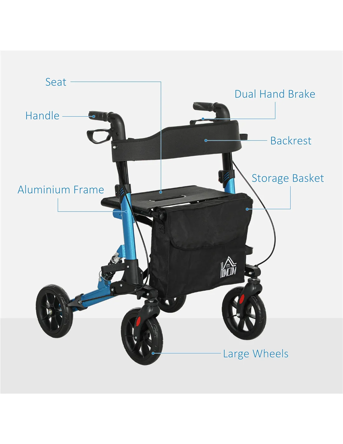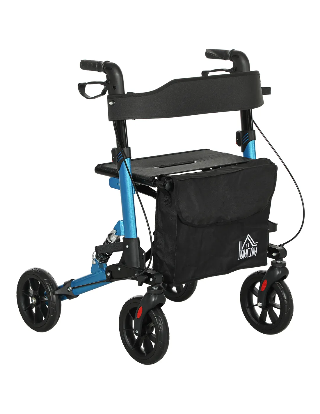 HOMCOM Folding Rollator Walker with Seat, Backrest, Lightweight Walking Frame with Storage Bag, Dual Brakes, Adjustable Handle Height, Suspension System, 4 Wheeled Walker for Seniors, Blue