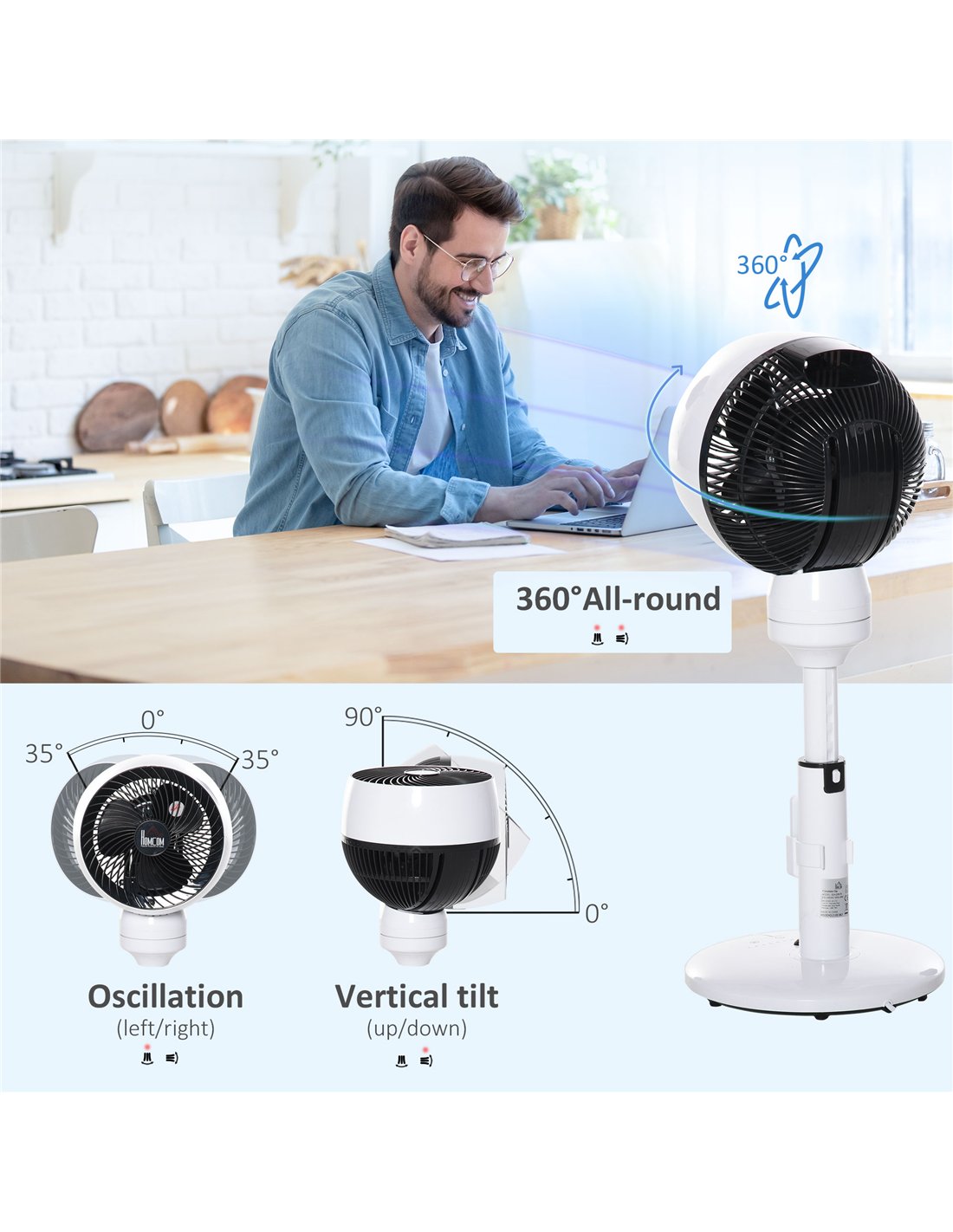 The HOMCOM 9'' Air Circulator Fan is a versatile cooling solution ideal for various indoor environments. Perfectly suited for living rooms, bedrooms, and office spaces, it provides personalised airflow control with its adjustable height, 70° oscillation, and 90° vertical tilt. Use it to create a refreshing breeze during warm summer days or to improve air circulation in stuffy rooms. Its sleek black and white design complements modern interiors, while the remote control allows effortless adjustments from across the room. Thanks to the 360° rotation, you can direct airflow precisely where needed, whether placed on a desk, bedside table, or floor.