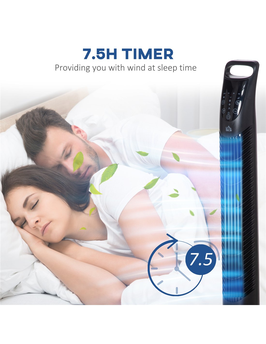 The HOMCOM 36'' freestanding tower fan is an excellent addition to any British home or office, providing efficient cooling during warmer months. Its slim, modern design fits seamlessly into living rooms, bedrooms, or workspaces without occupying much floor space. Use the fan’s 70-degree oscillation to circulate air evenly across larger rooms, ensuring a comfortable environment. The three adjustable speeds and wind modes allow you to tailor airflow to your preference, whether you need a gentle breeze for restful sleep or a stronger airflow for busy office hours. The 7.5-hour timer is perfect for overnight use, automatically switching off to save energy. Thanks to the 5-metre remote control, adjusting settings from across the room is effortless, making it ideal for those relaxing evenings or busy workdays.