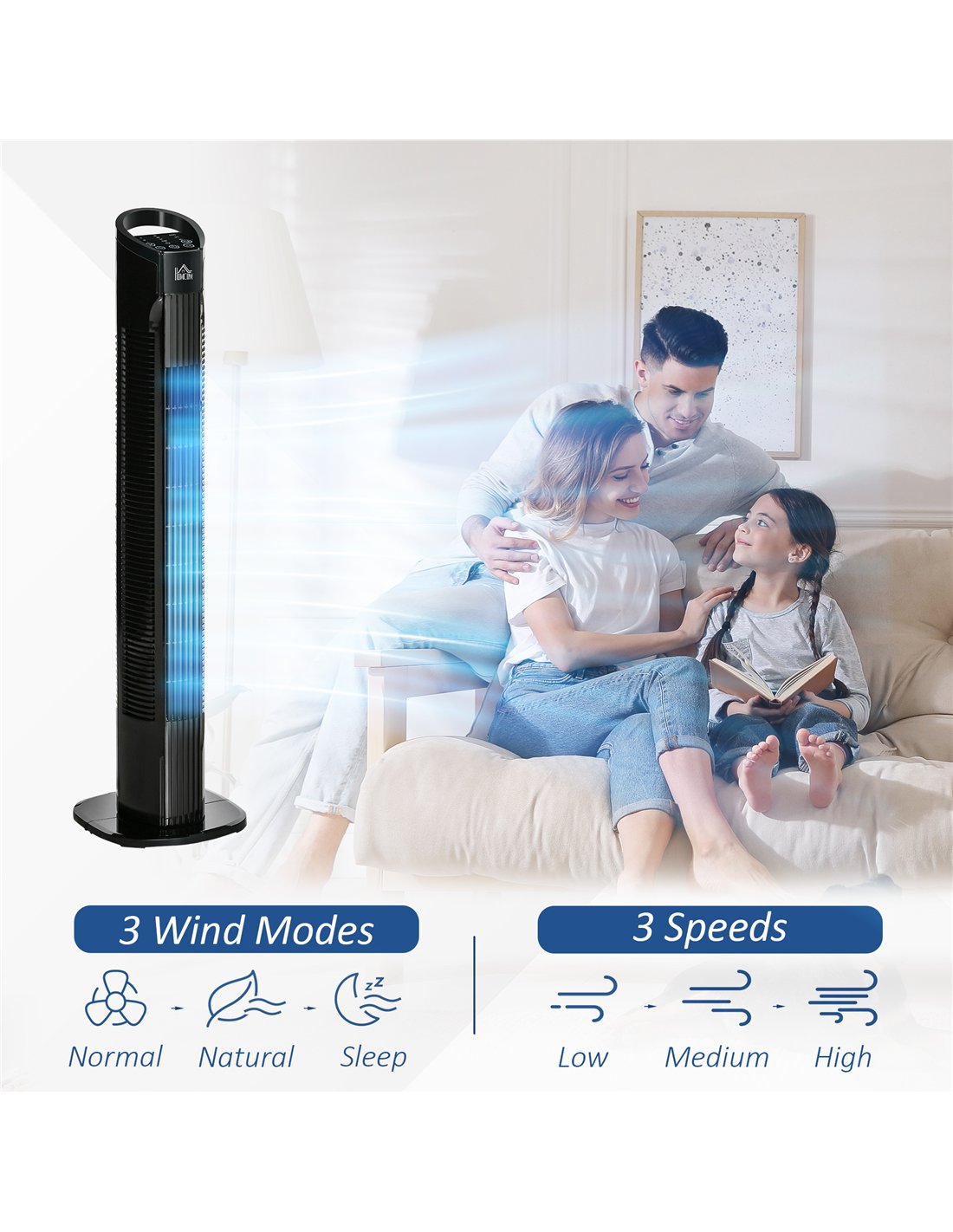 - Modern look freestanding tower fan fits living room, bedroom, office using