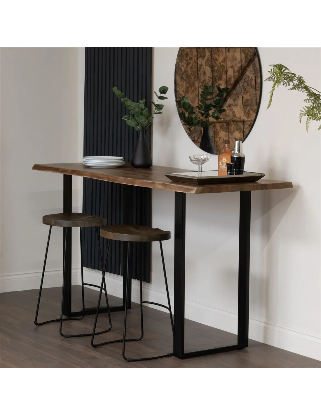 The Hill Interiors Live Edge Large Bar Table 22701 is a versatile addition to any British home, perfectly suited for a variety of settings. Use it as a striking centrepiece in your home bar, where its natural acacia wood and industrial metal frame create an inviting atmosphere for entertaining guests. It also works beautifully as a breakfast bar in an open-plan kitchen, offering ample space for casual dining or socialising. For those with a creative workspace or studio, this table provides a sturdy yet stylish surface that blends rustic charm with modern design. Its robust construction and unique live edge detail make it ideal for both everyday use and special occasions, enhancing any living area with warmth and character.