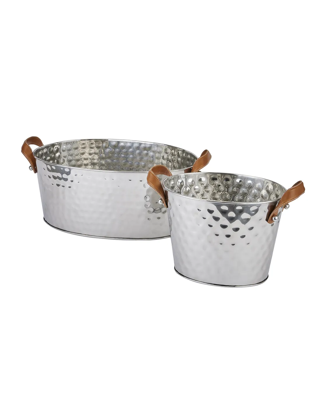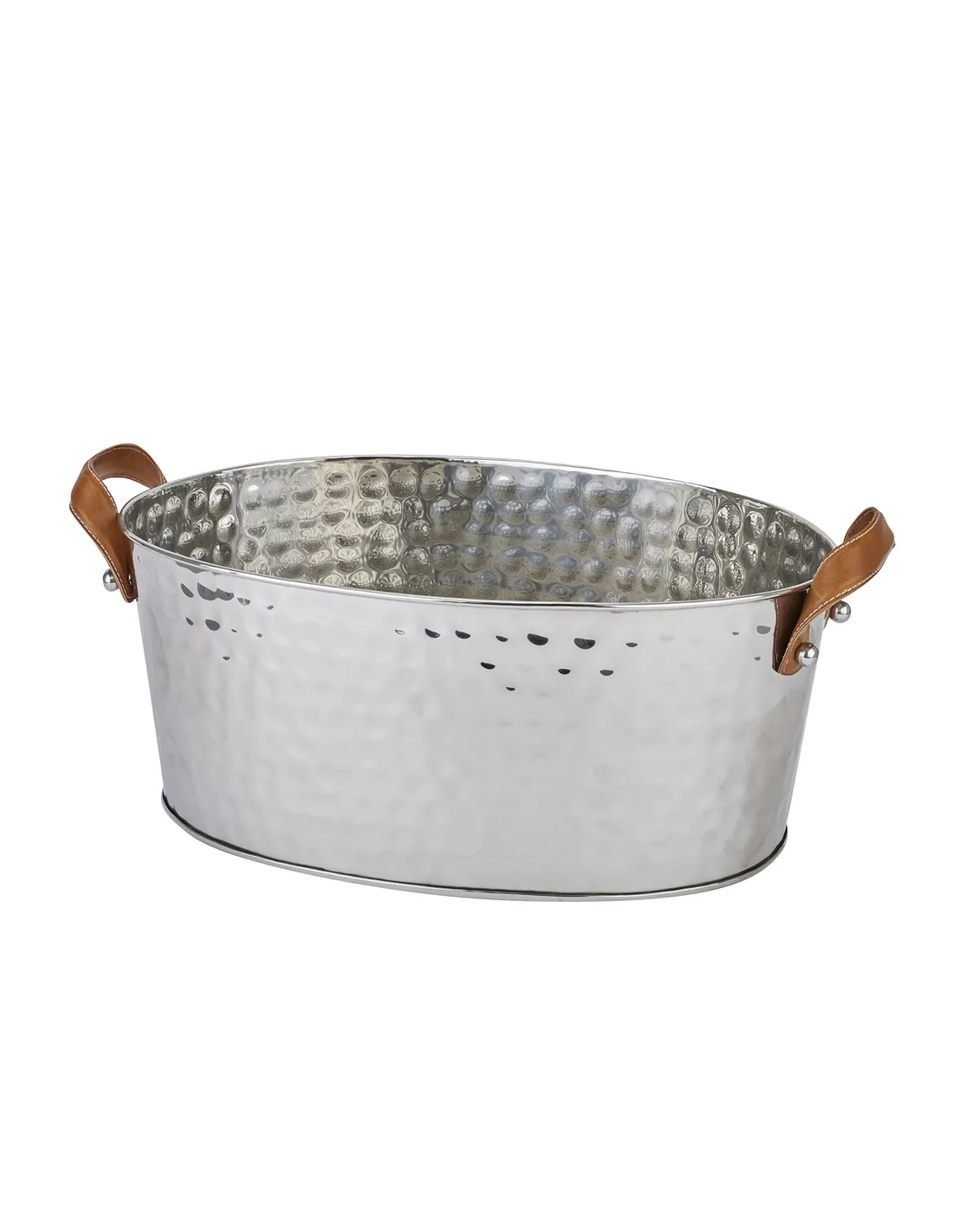 - The cooler is crafted from high-quality metal with a hammered silver finish and features genuine leather handles for added durability and style.