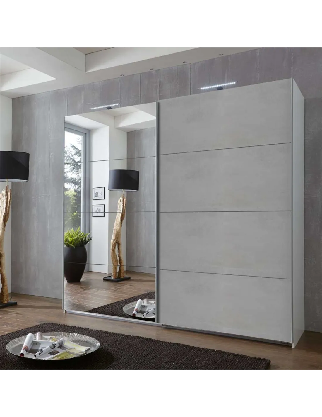- The wardrobe’s sleek concrete grey finish combined with mirrored sliding doors complements modern and minimalist interiors perfectly. It brightens smaller bedrooms by reflecting natural light, while its spacious design suits master bedrooms or guest rooms needing efficient storage solutions.