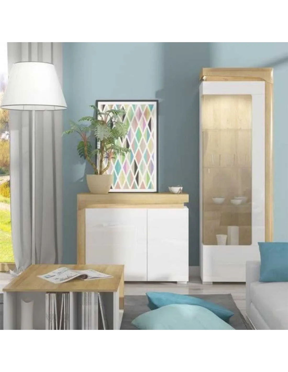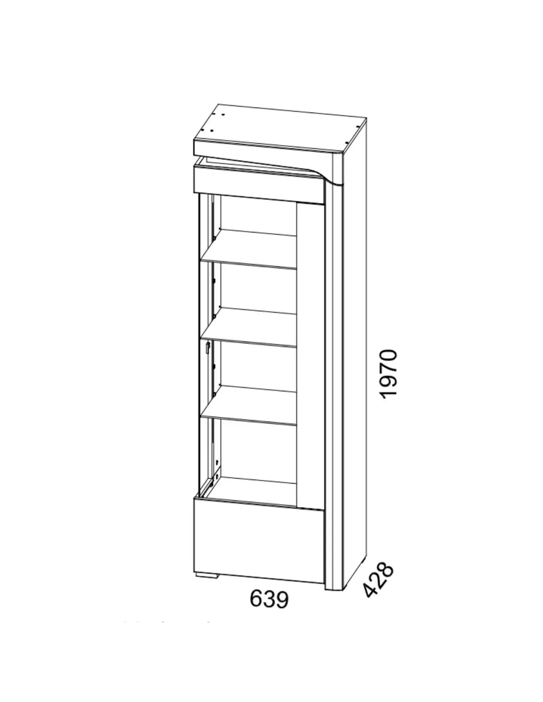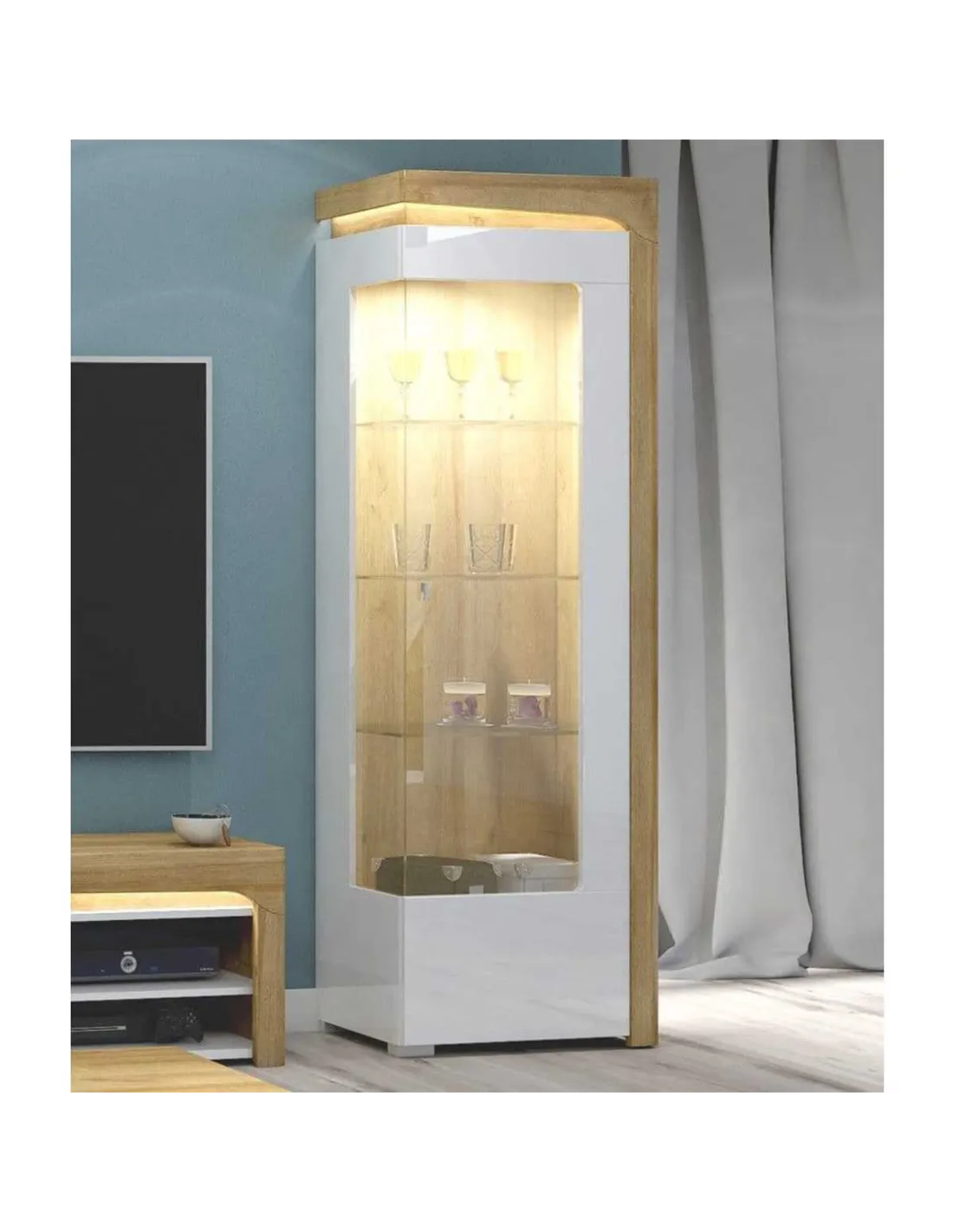 Transform your living space with this amazing display cabinet, a perfect blend of style and functionality. The oak effect surround paired with a sleek white gloss finish offers an instant touch of sophistication to any room. With its exclusive glass door and three glass shelves, this cabinet is ideal for showcasing your cherished items. The integrated LED lights enhance the display, creating a warm and inviting atmosphere.