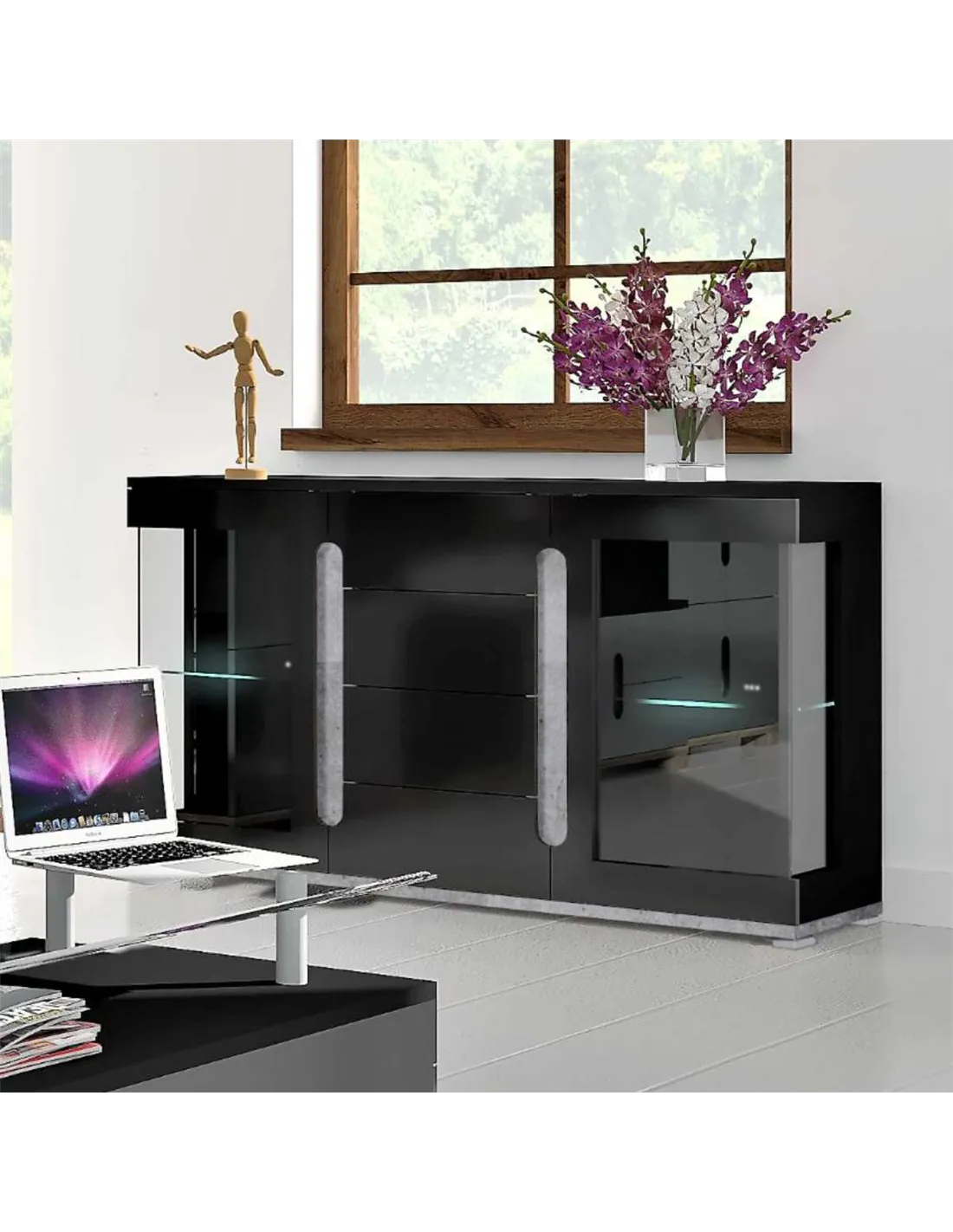 - The Elise sideboard combines a sleek black high gloss finish with concrete grey accents and matt white panels, creating a contemporary aesthetic. It includes two glass doors, four spacious drawers, and integrated LED lighting to enhance ambience. Its dimensions are H85cm, W139cm, D42cm, offering generous storage for living or dining areas.