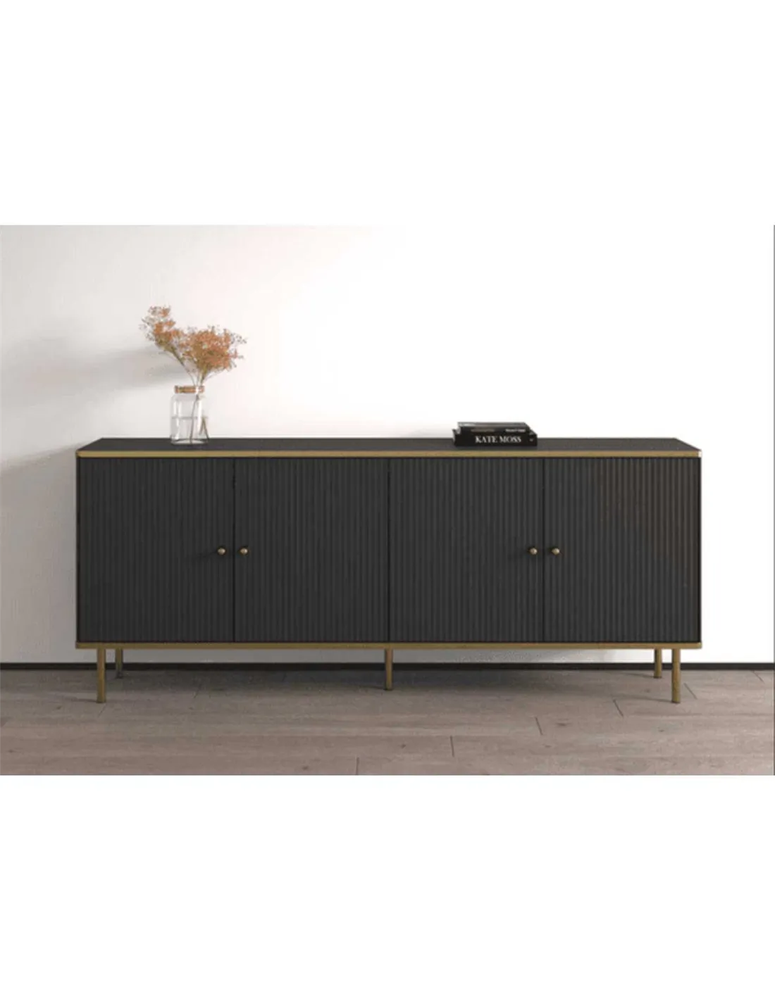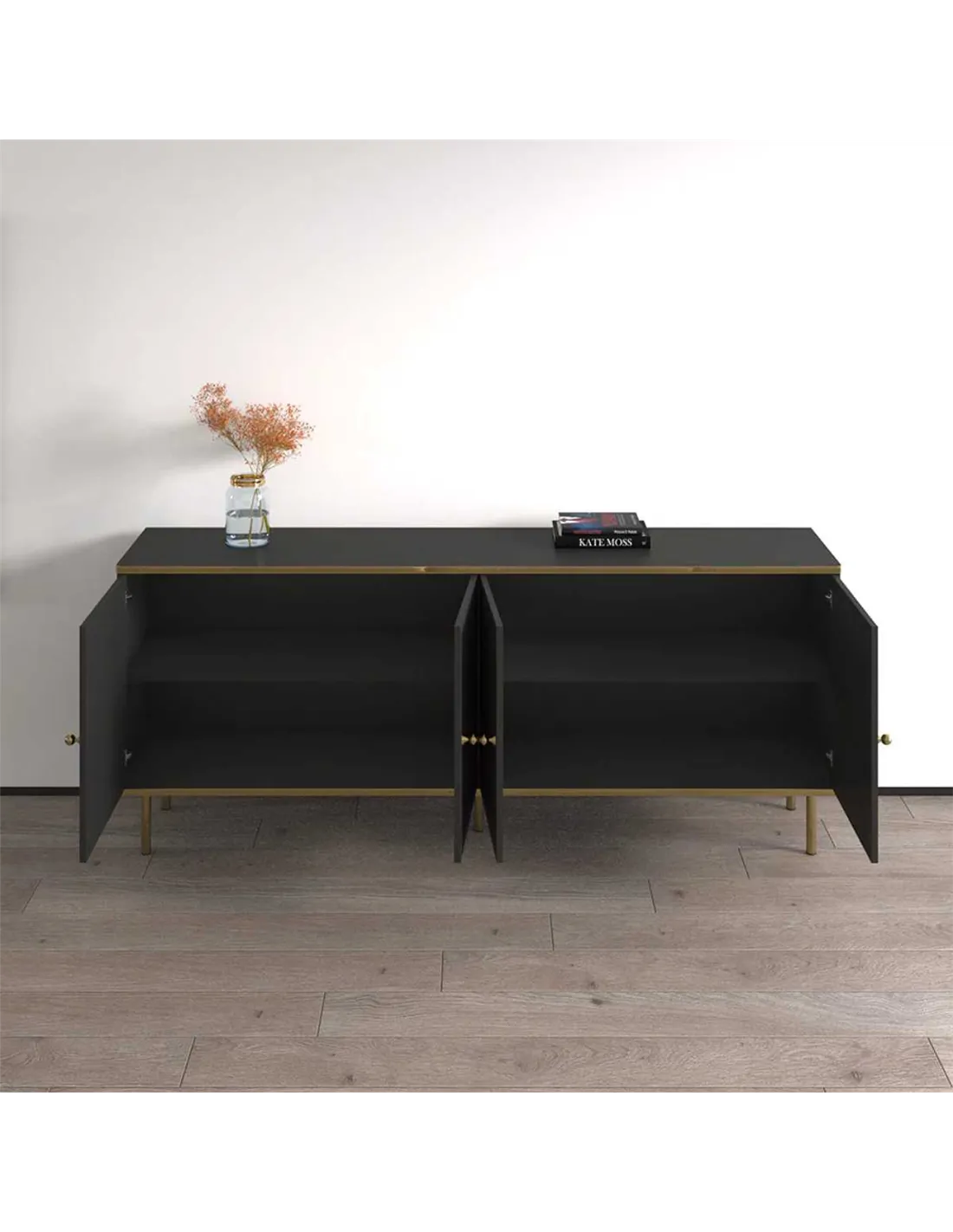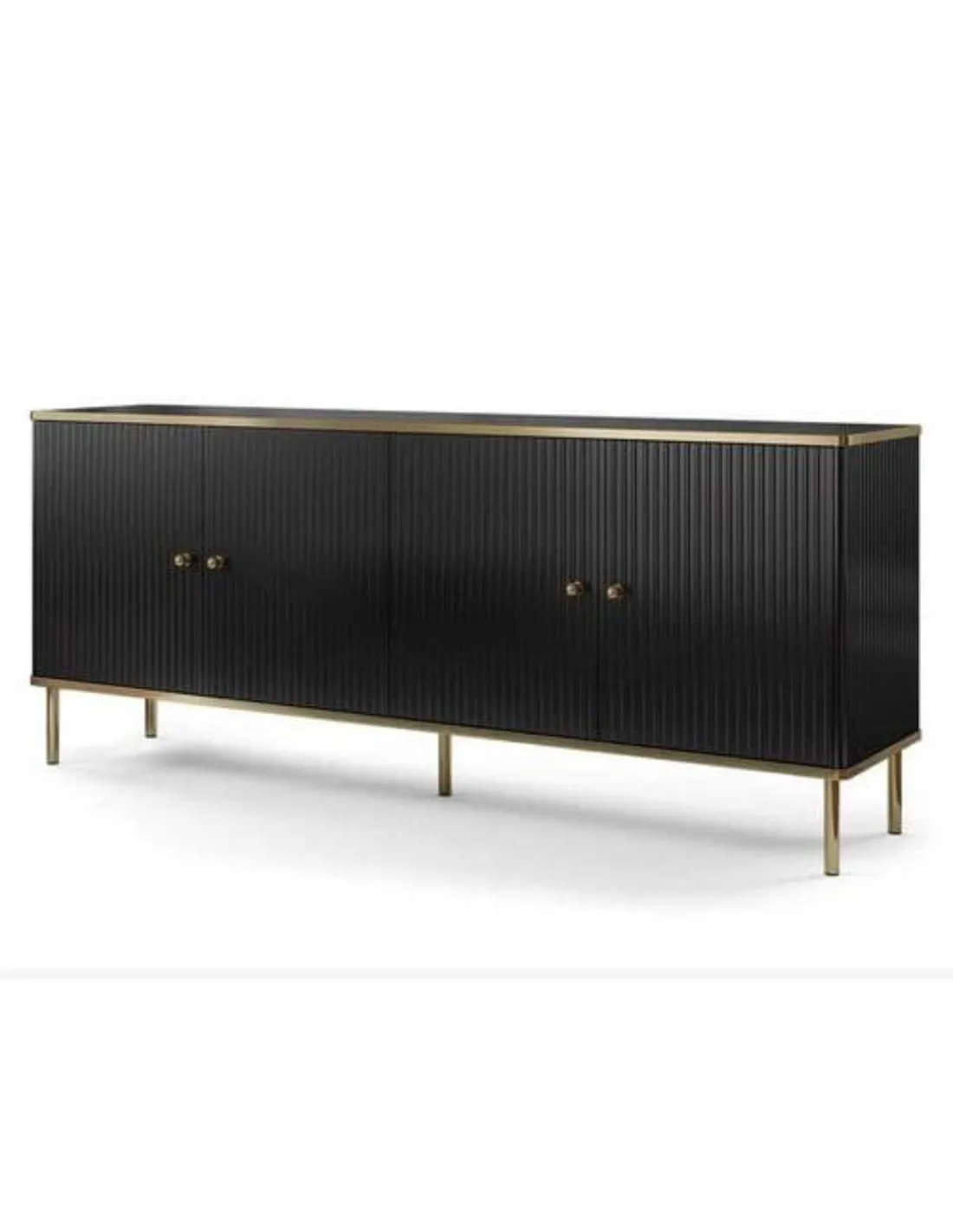 Transform your living space with this amazing sideboard, a perfect blend of style and functionality. The sophisticated black finish, complemented by exclusive gold detailing, makes it an instant focal point in any room. With four spacious doors and internal shelves, it offers ample storage, keeping your home organised and chic. The elegant gold handles and edging add a touch of luxury, making it ideal for both modern and classic interiors.