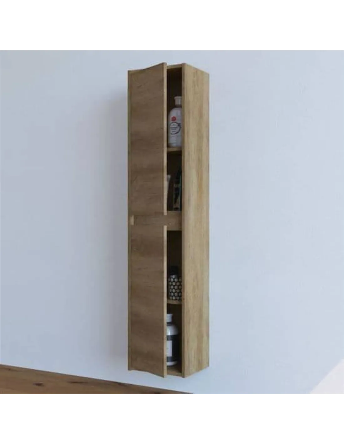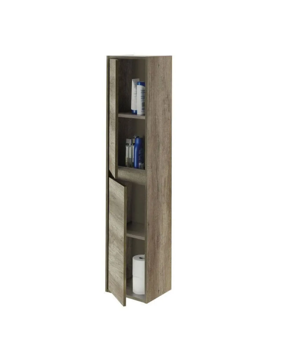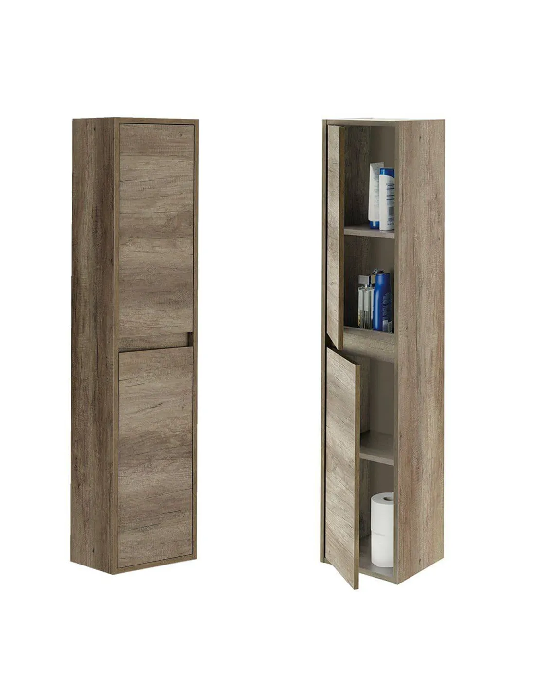 - This wall-mounted storage cupboard is perfect for organising bathroom essentials such as toiletries, towels, and cleaning products. Its sleek Nordic oak finish complements modern and traditional interiors alike, making it a versatile addition to any bathroom or ensuite. Thanks to its tall, slim design, it fits well in compact spaces while maximising vertical storage.