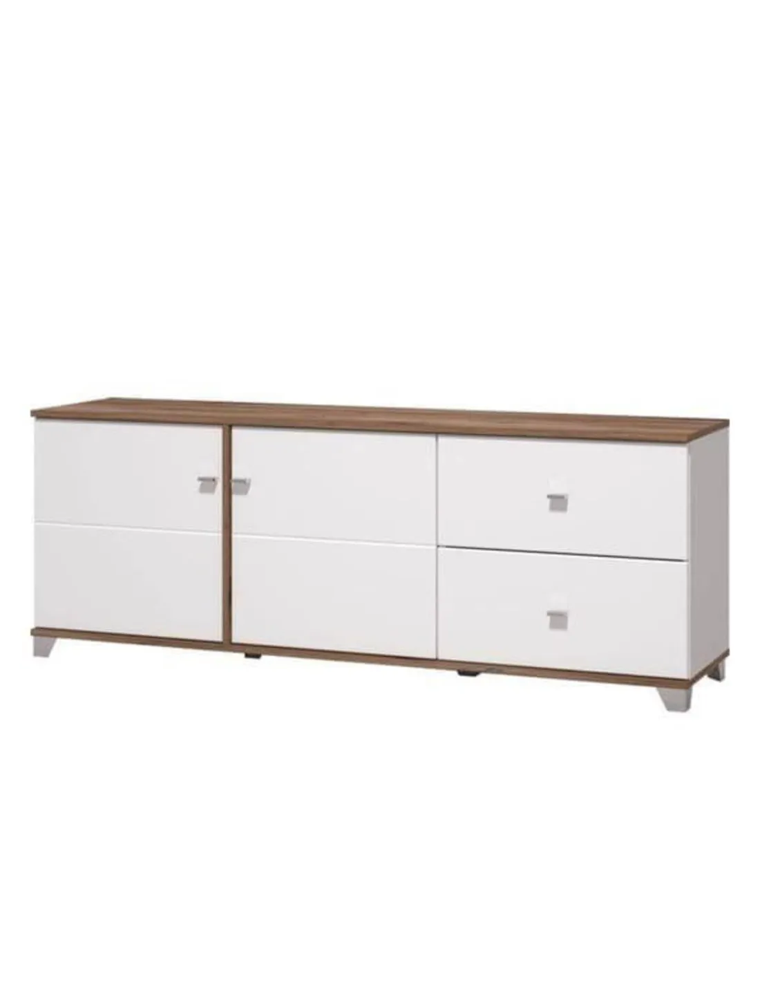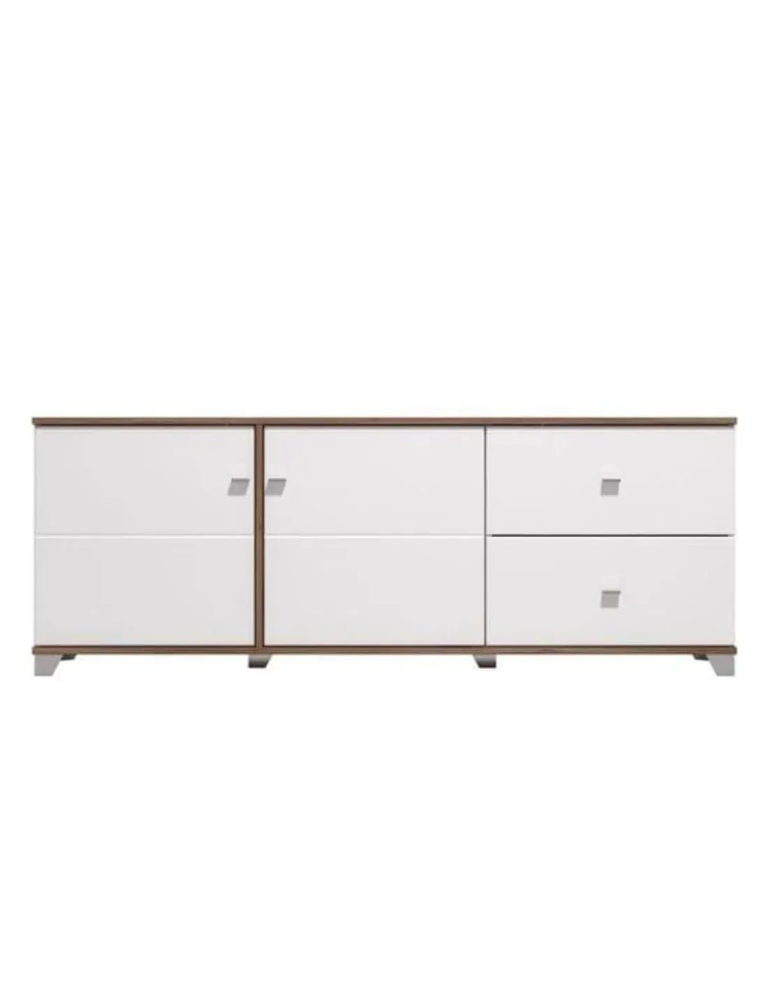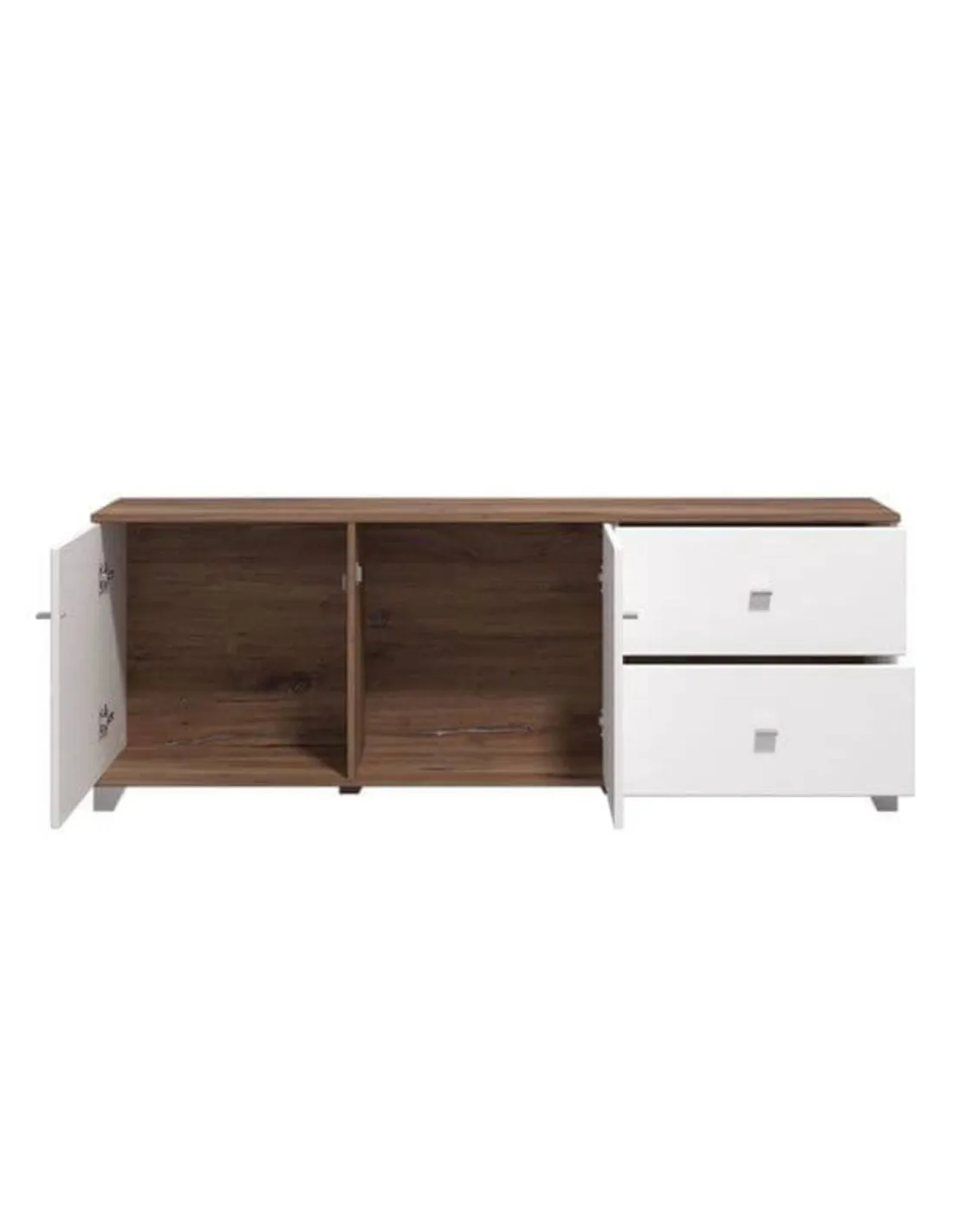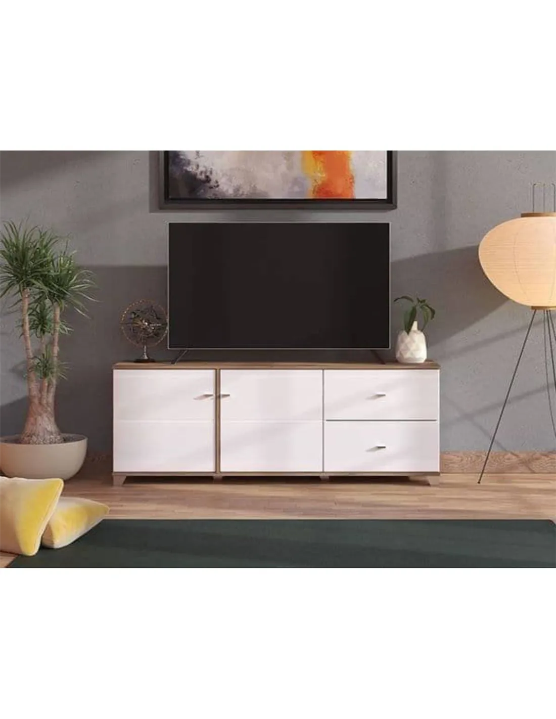 - The cabinet combines a sleek white high-gloss finish with warm oak detailing, offering a stylish yet practical storage solution. It includes two doors and two drawers, providing ample space for media devices, accessories, and other living room essentials. Its dimensions are H 59.5cm x W 162cm x D 40cm, making it suitable for a variety of room sizes.