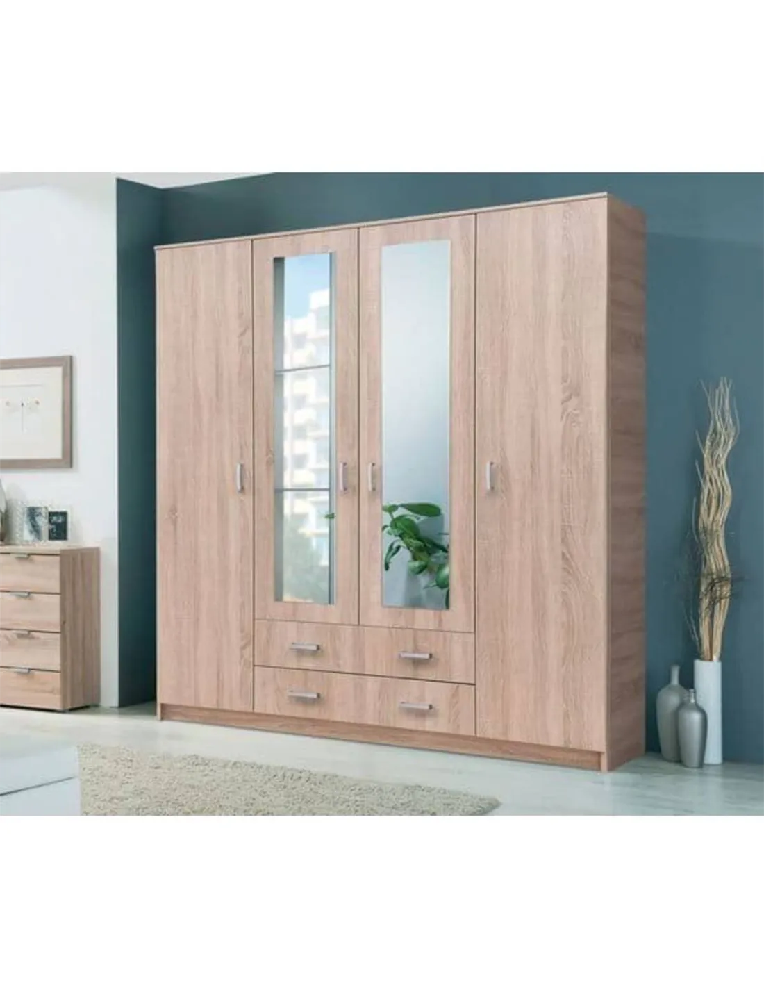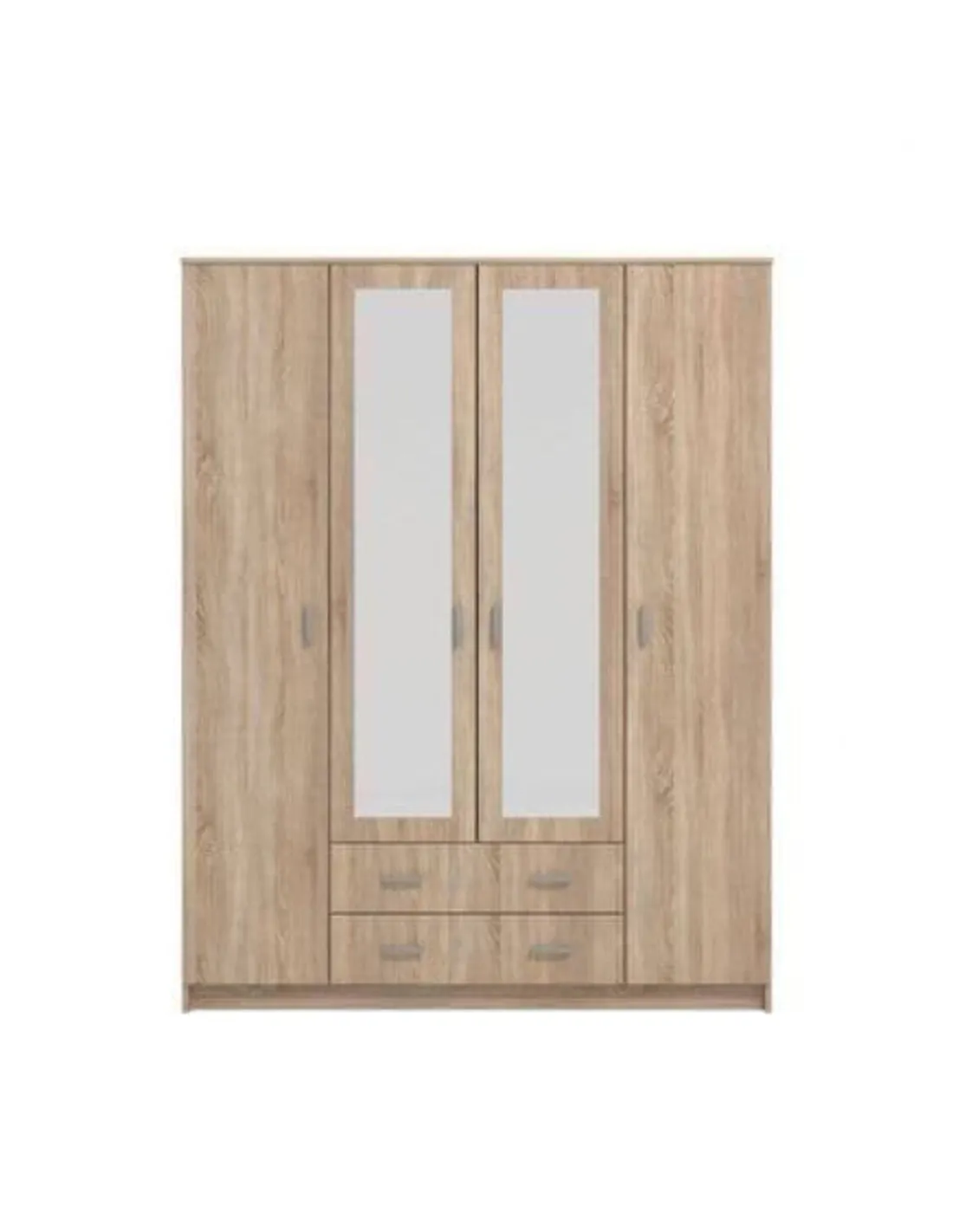 - Thanks to its natural Sonoma Oak effect finish, this wardrobe complements both modern and traditional interiors. It offers versatile storage with four doors and two drawers, ideal for organising clothing, accessories, and linens efficiently.
