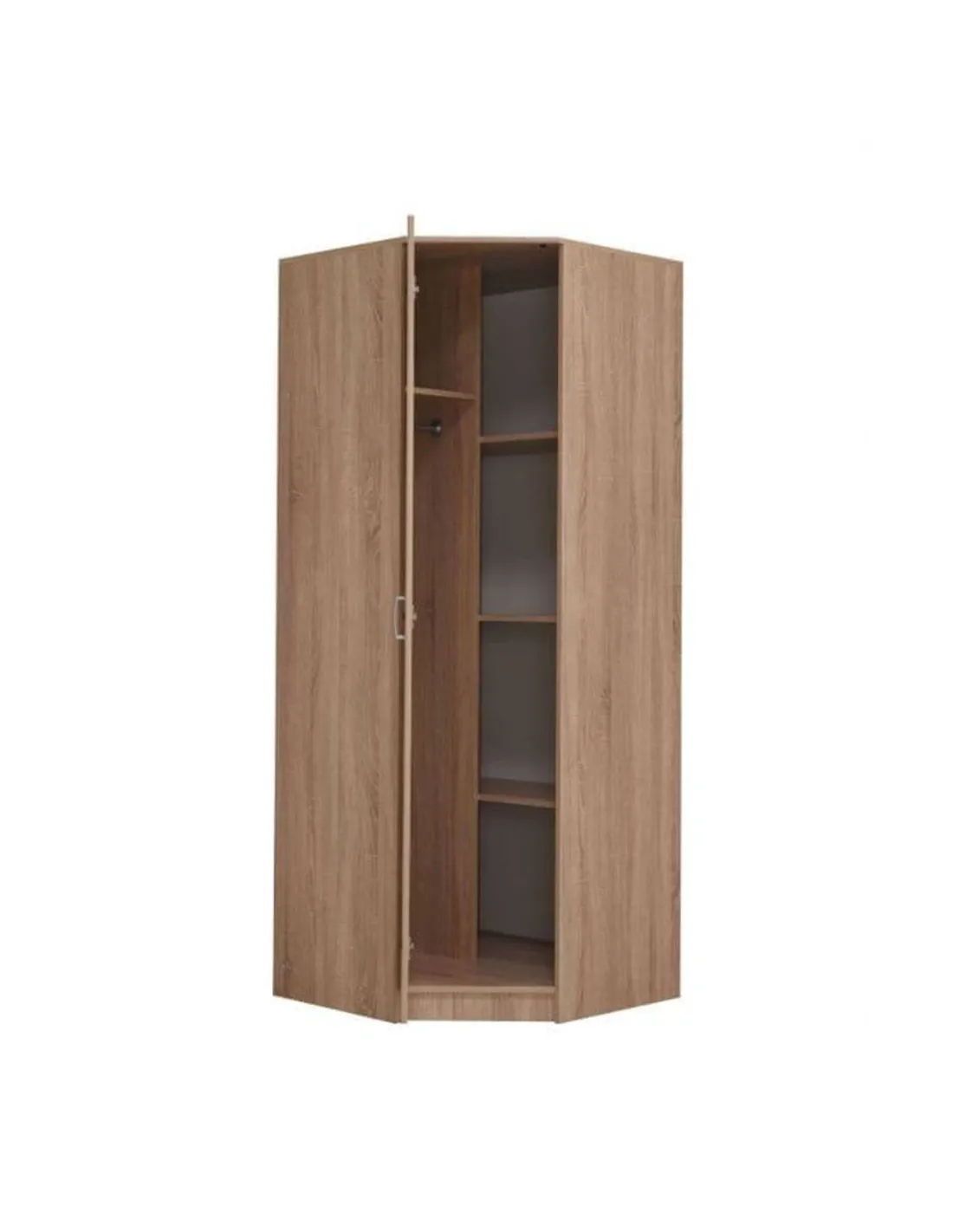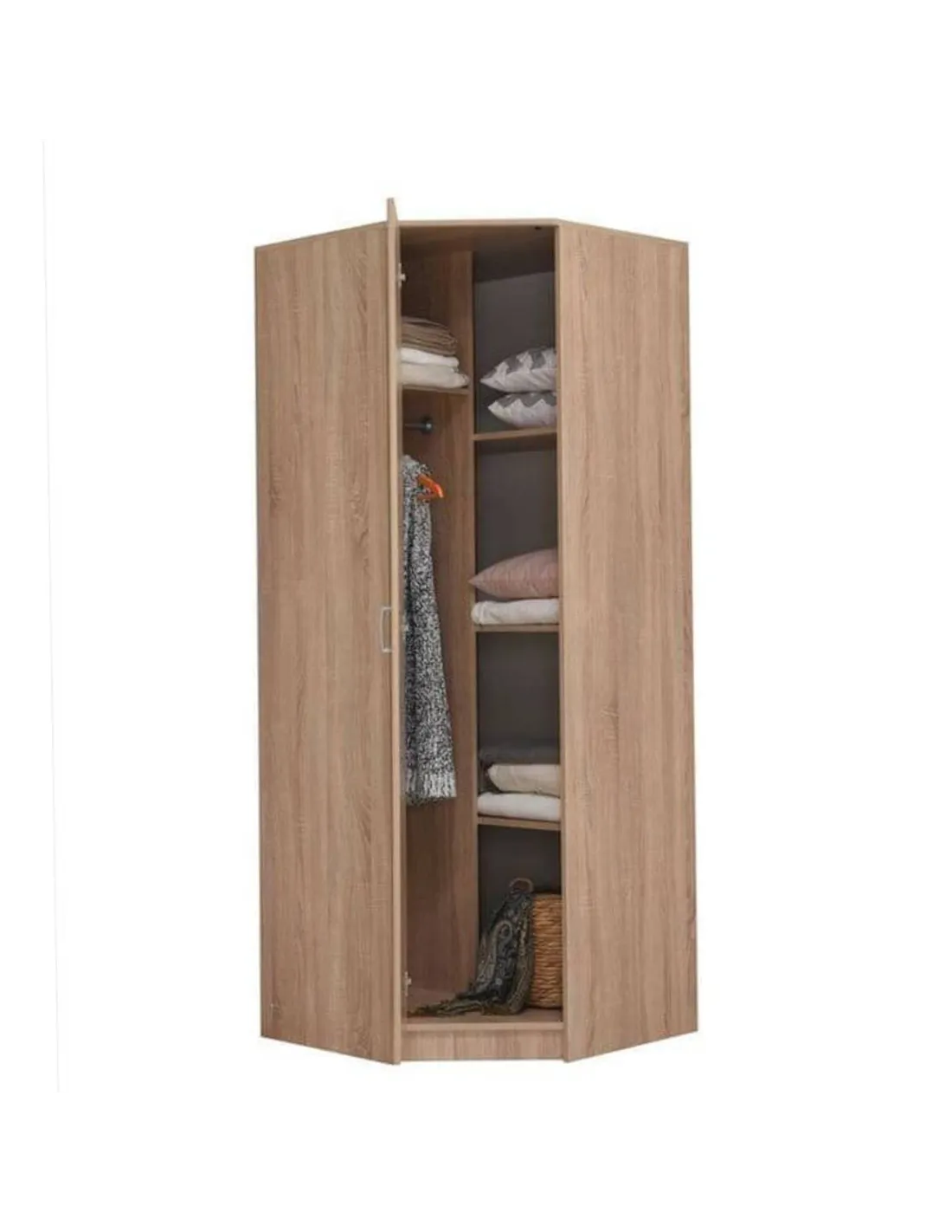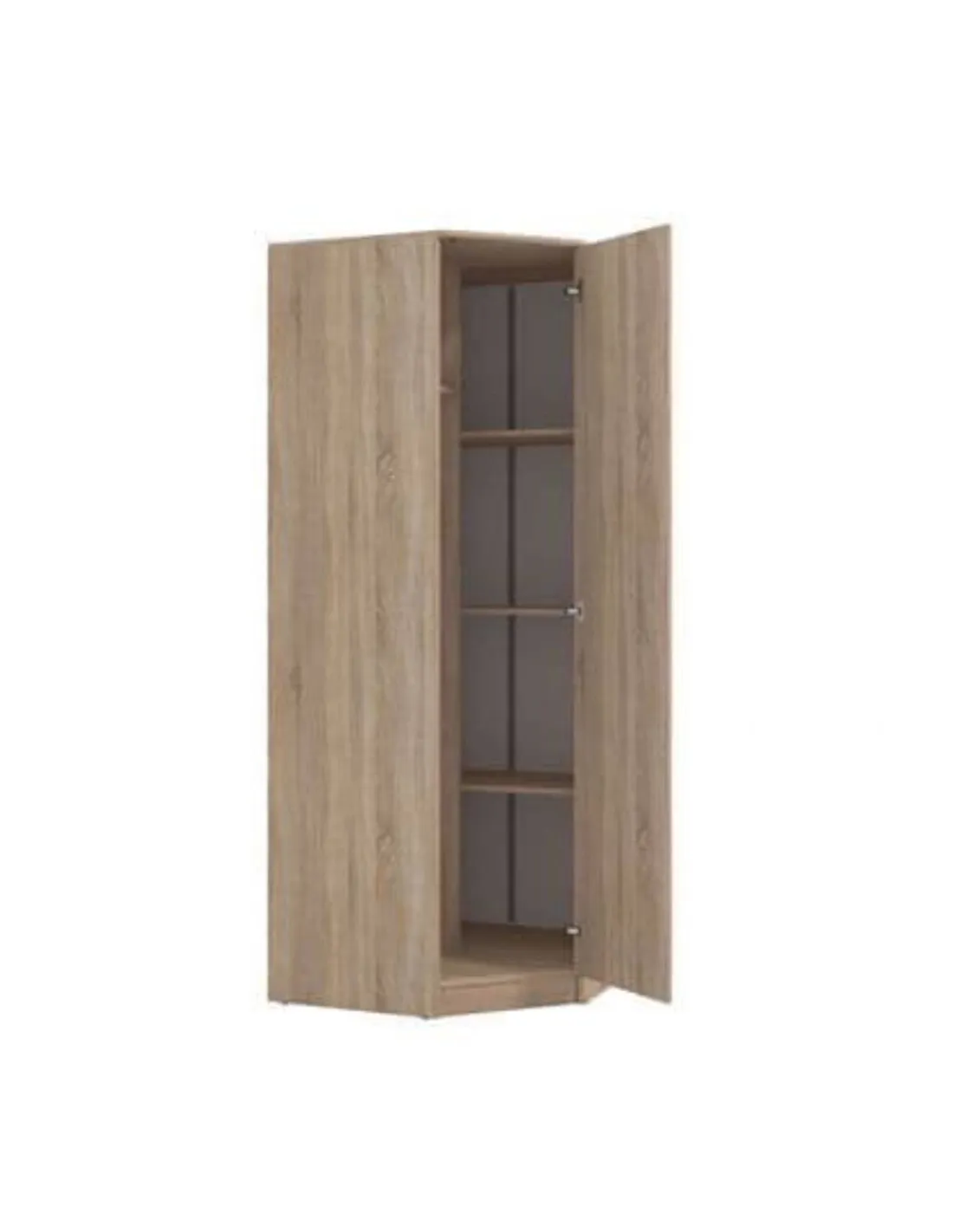 - This corner wardrobe offers a stylish Sonoma Oak finish, designed to fit neatly into any corner, maximising room space. It includes a single door, a practical hanging rail, and five roomy shelves, ideal for organising clothes, accessories, and other essentials. Its dimensions are 80cm length x 80cm width x 205.1cm height, making it a compact yet spacious storage solution.