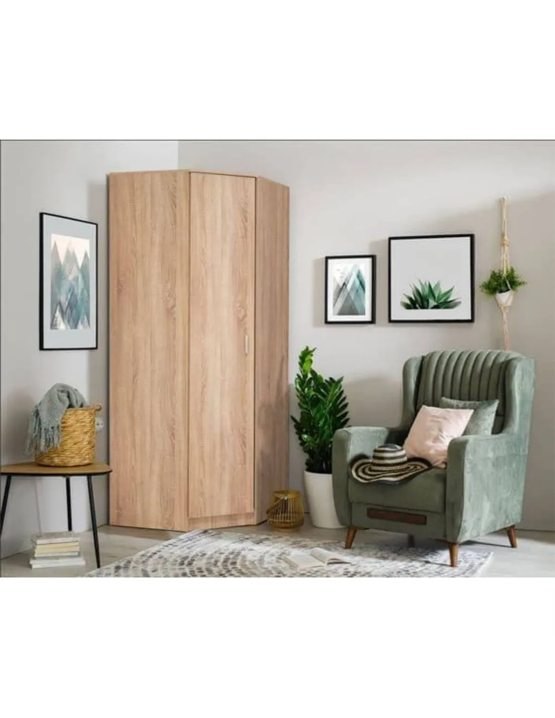 - Thanks to its corner design and neutral Sonoma Oak effect, this wardrobe complements various interior styles, from modern to traditional. It is perfect for bedrooms, guest rooms, or even hallway spaces where extra storage is needed without occupying much floor area. Customers often use it to create a tidy, organised environment while adding a touch of elegance.