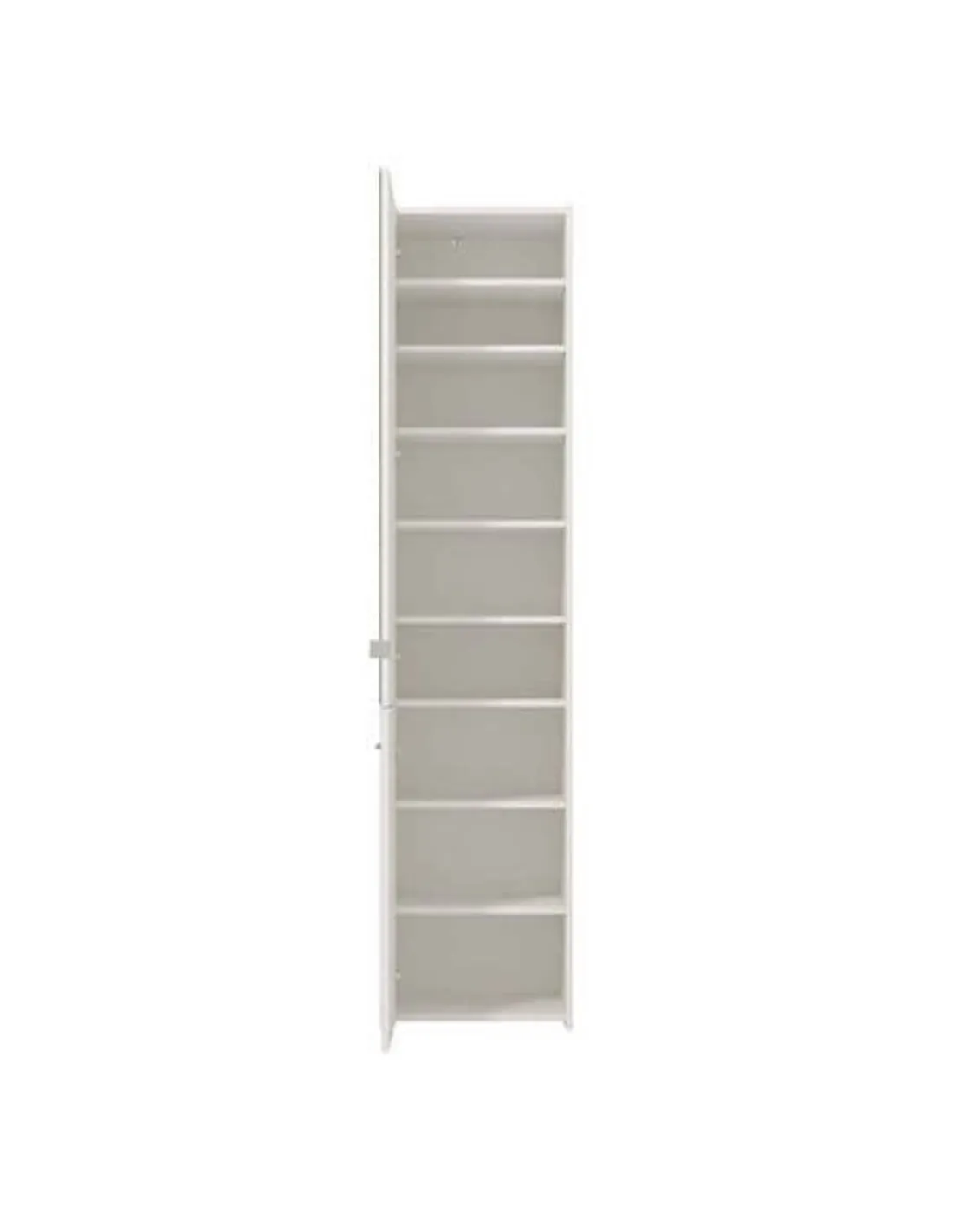 - The cabinet boasts a sleek white finish paired with a full-length mirrored door, designed to fit narrow spaces with its slim and tall frame. It includes eight internal shelves, providing generous storage for various footwear types, helping to keep your hallway tidy and organised.