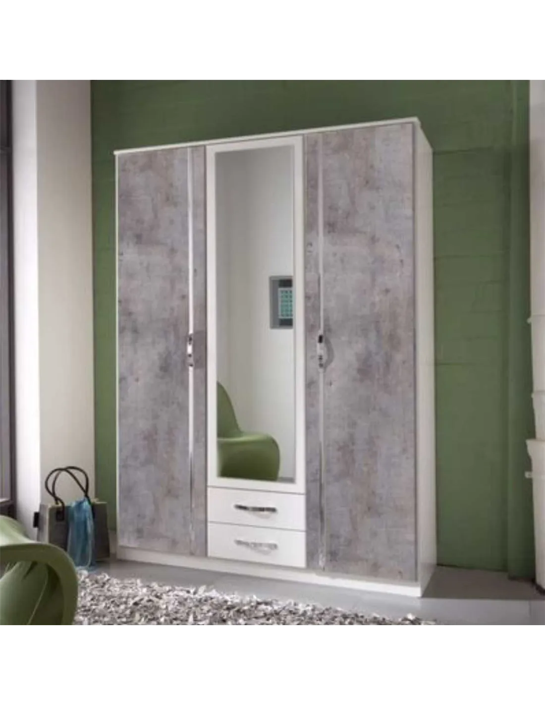- The wardrobe boasts a modern concrete grey and white finish, combining style with practicality. It includes three doors, two spacious drawers, four shelves, and a hanging rail, providing versatile storage options ideal for organising clothes, accessories, and linens.