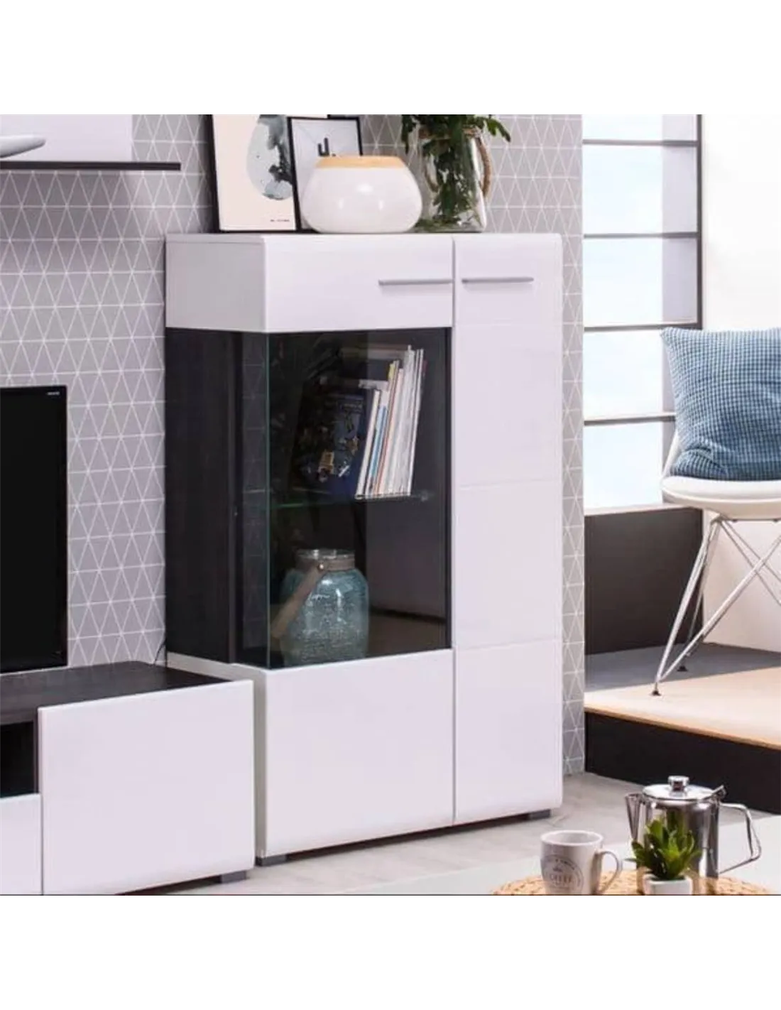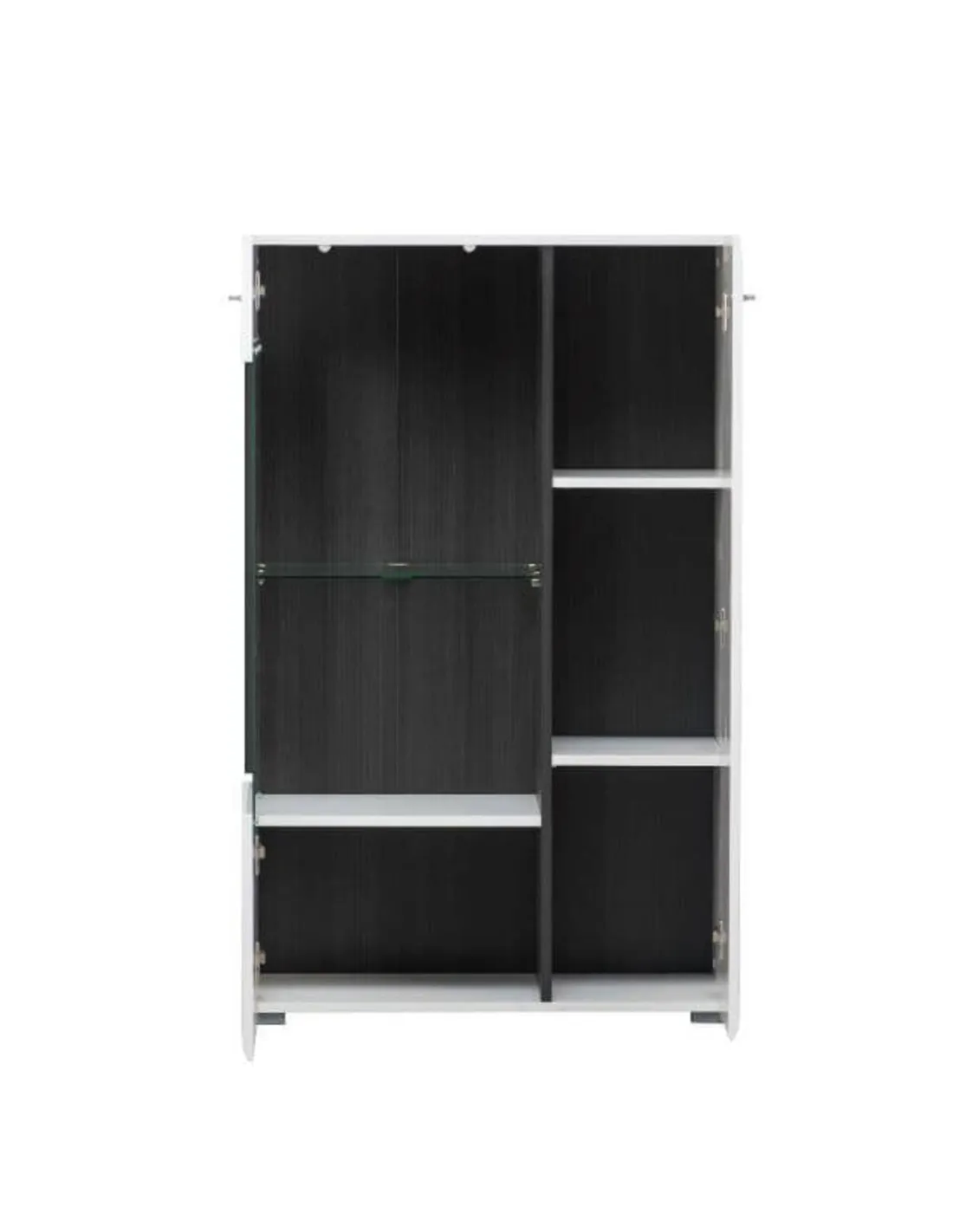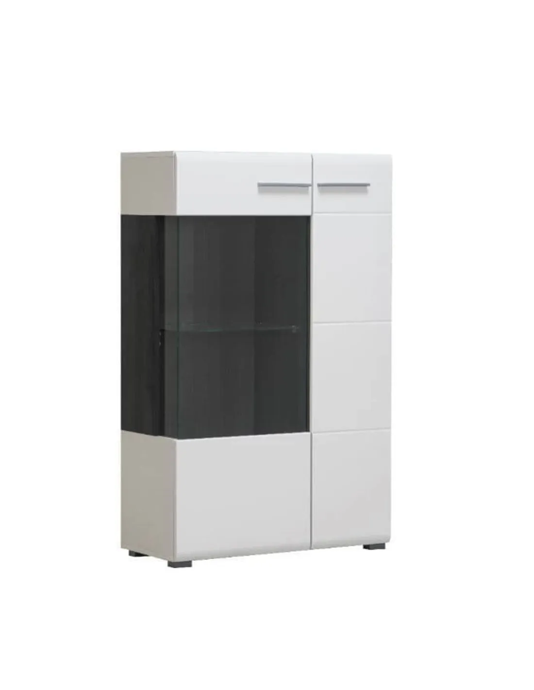 Transform your living space with the Royce White Short Display Cabinet, a stunning blend of style and practicality. This exclusive piece offers an instant upgrade to any room, featuring a sleek gloss white front paired with matte sides for a chic, modern look. The bold black interior provides a striking contrast, making your displayed items pop with elegance.
