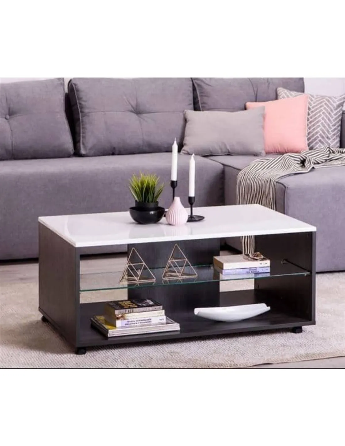 - This versatile piece suits modern interiors perfectly. Use it as a central surface for drinks and snacks, a display area for books or decorative items, or as additional storage thanks to its tempered glass shelf. Its contemporary design complements a variety of décor styles.