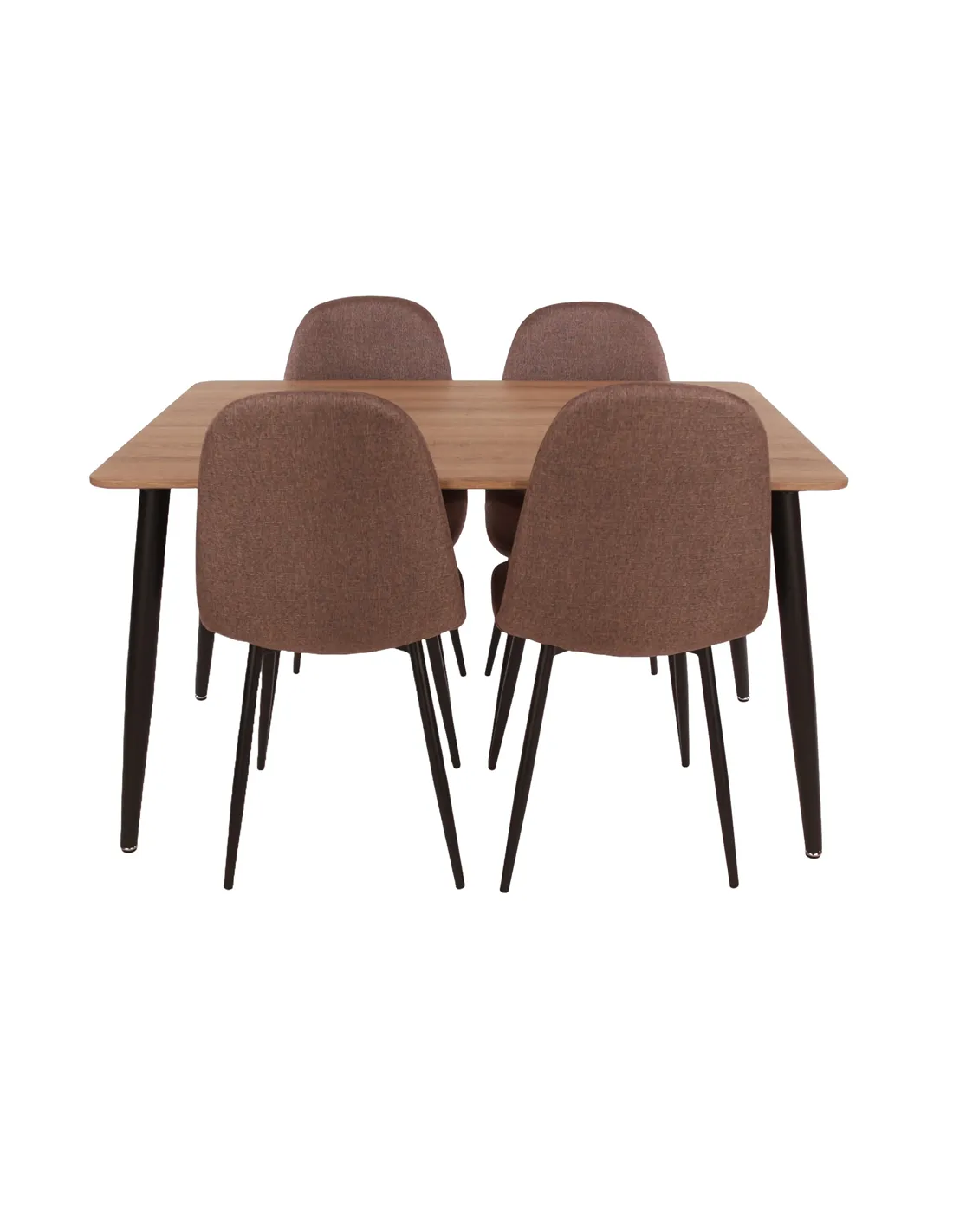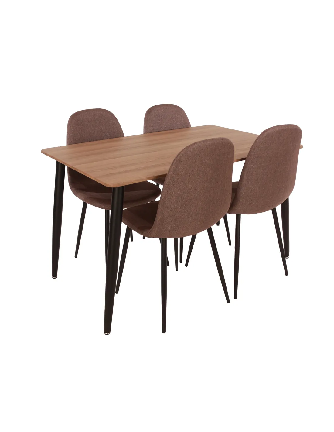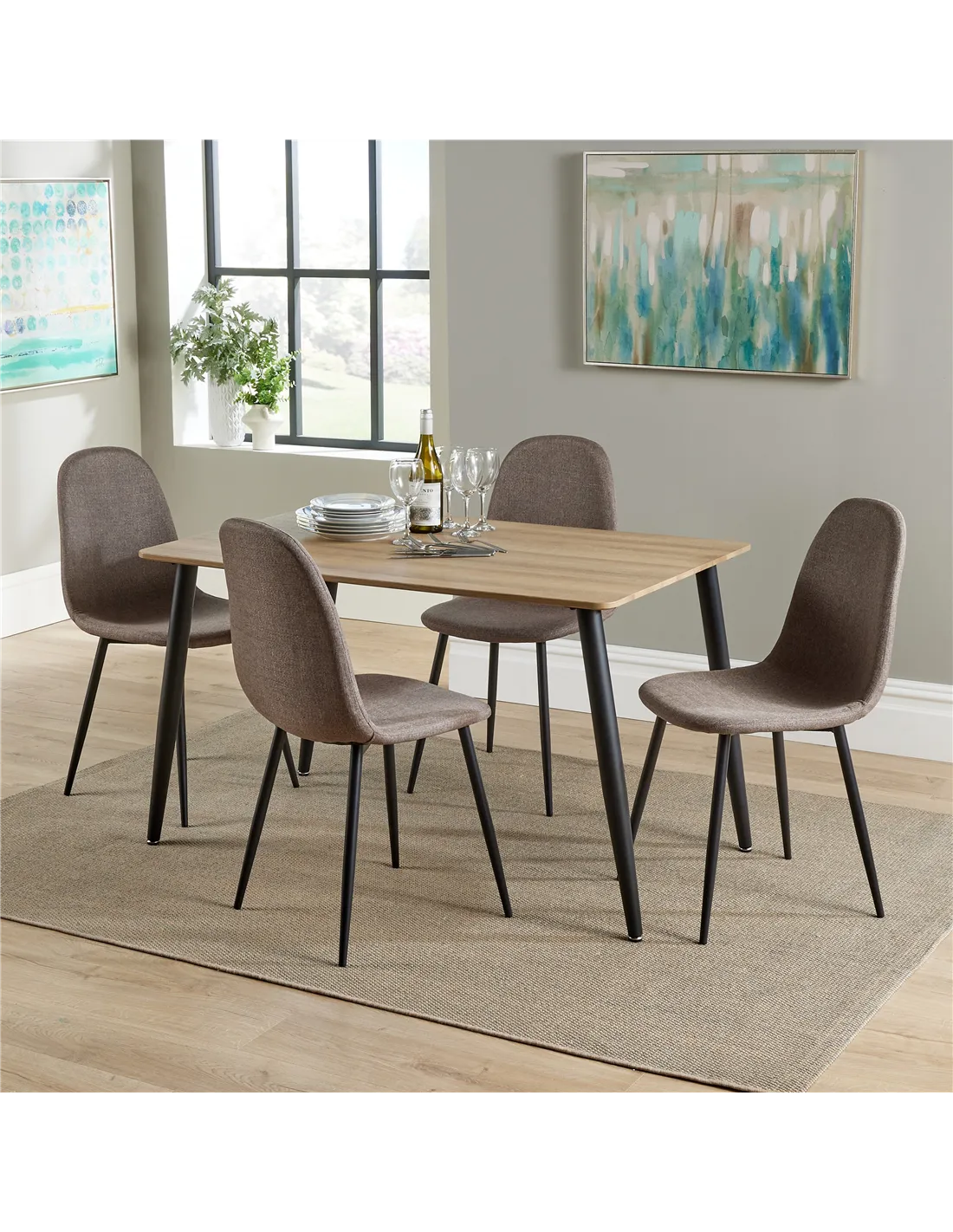 The dining table boasts a generous 120cm x 80cm surface, featuring a hardwearing aged oak effect foiled top that exudes timeless elegance. Complementing the table are four beautifully upholstered chairs in a warm brown fabric, each supported by sturdy tubular steel legs. This combination of materials not only ensures durability but also adds a touch of sophistication to your home.